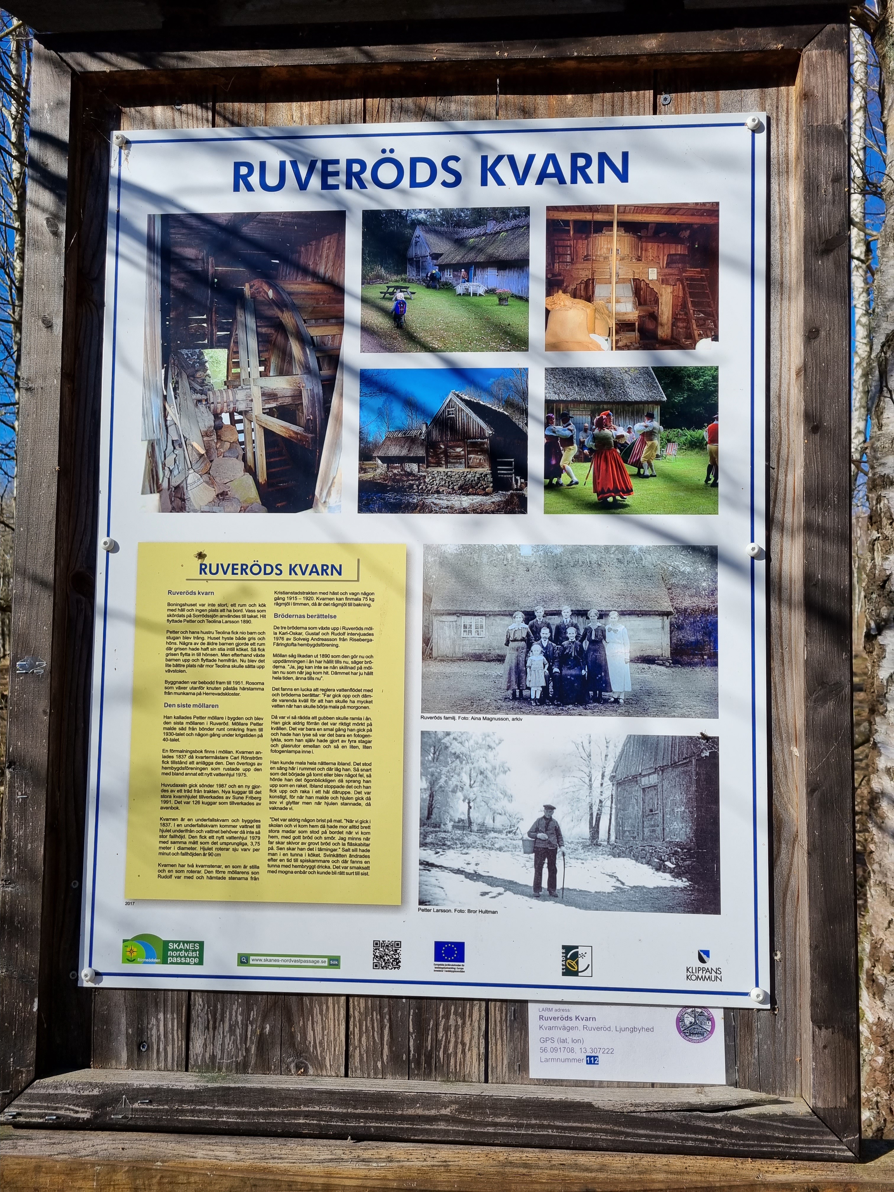 Ibland utgår våra vandringar från Ruveröds Kvarn. En trevlig runda på ca 2,7 km är när vi går förbi kvarnen och ett bostadshus, följer bilvägen några hundra meter och efter bron tar vi höger. Följer ån till dämmet och där blir det fika innan vi fortsätter och huxflux är tillbaka vid kvarnen igen.