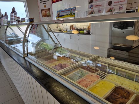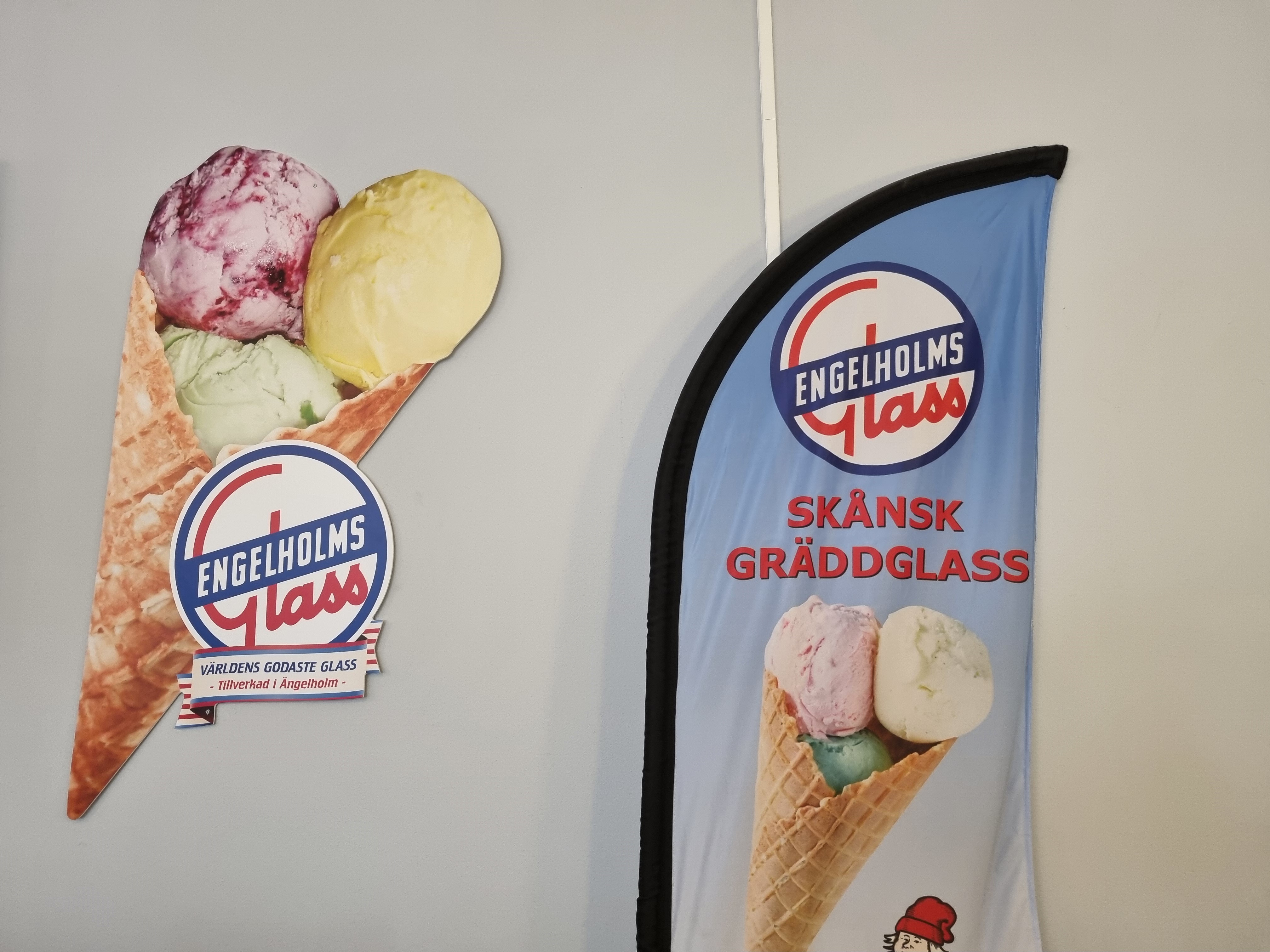 Nu vet vi mer om företagets långa historia och produktion, att mer än 60 personer jobbar där (sommartid) och vilket stort sortiment de har. Här kommer vi säkert att stanna till fler gånger för att äta glass på caféet och köpa med oss hem.😋👍