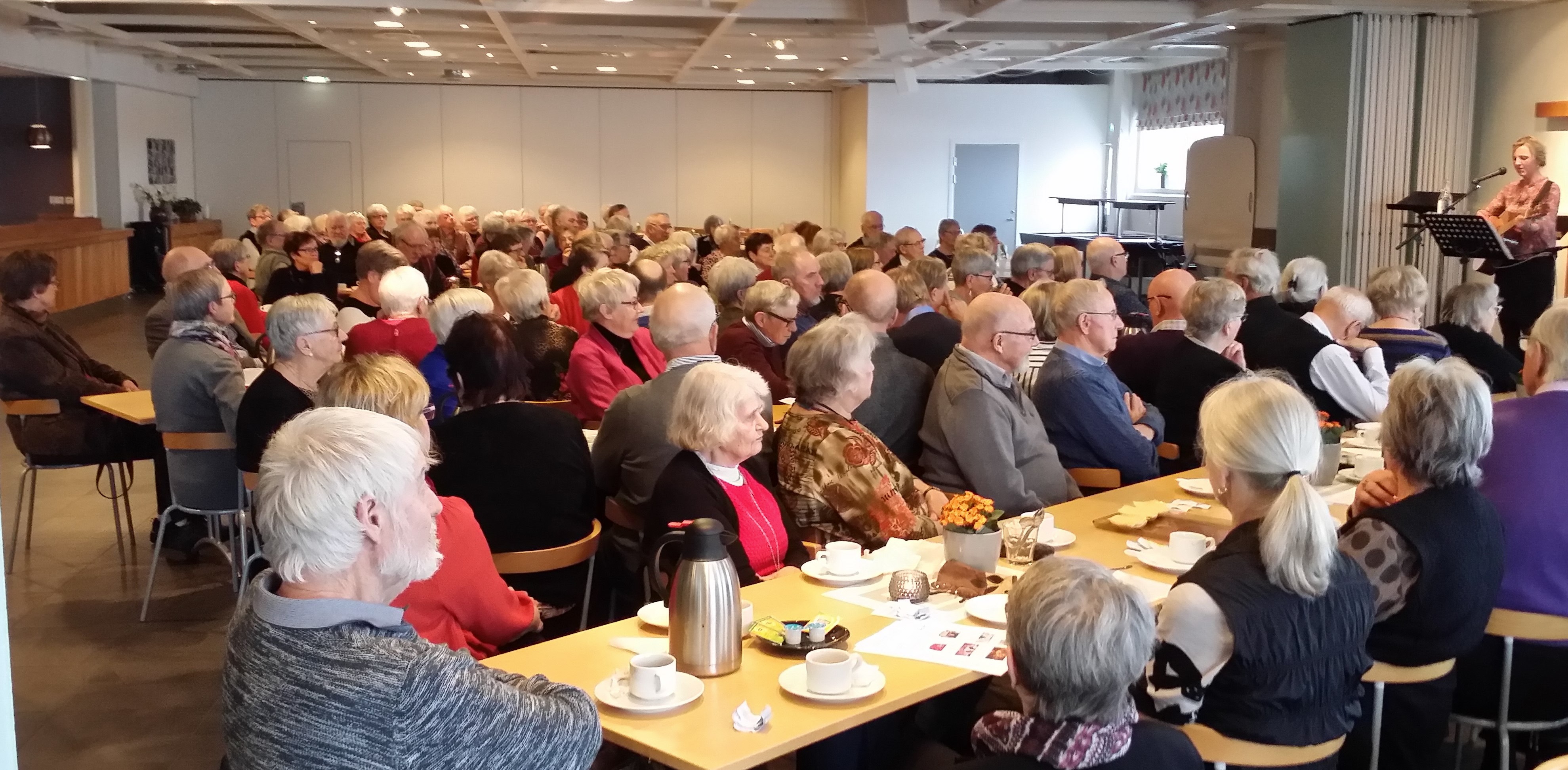 Nyligen hade etthundratrettio förväntansfulla medlemmar i SPF Seniorerna i Falköping samlats i Pingstkyrkans cafélokal för att umgås och lyssna till Falköpings mejeris VD Anders Segerström. Som extra programpunkt efter kaffet såg man fram emot att lyssna till Mathilda Eklund i hennes visprogram. Föreningens Roland Nilsson hälsade alla välkomna och bjöd Anders Segerström att berätta om Falköpings mejeri och den omvärld där mejeriet verkar. Medlemmarna fick mycket innehållsrik redogörelse för mejeriet som har 144 mjölkbönder som ägare inom en radie av 70 kilometer från mejeriet. Miljöhänsyn och lokal produktion av mjölken är A och O i verksamheten. Så många som 20 av producenterna är KRAV-anslutna. Svenska bönder är näst bäst i världen i att minimera antibiotika i djurskötseln. Den pågående utbyggnaden utmed Bangatan berördes också. Endast vid pastöriseringen behöver mejeriet producera egen värme, i framtiden med pellets. Grådö är ett helägt dotterbolag i trakten av Avesta. För att behålla svensk bondenäring skall vi se upp med produkter som inte är SE-märkta. Efter vederbörlig avtackning med blommor och choklad var det dags för det stora kaffekalaset. Samtalen bordsgrannar emellan kom igång och det glada sorlet steg efter påtåren. När så Mathilda Eklund steg upp på scenen var förväntningarna höga och de infriades. Hennes klara sopran och finstämda sångstil var en fröjd att lyssna till. Hon bjöd på en bukett visor av det slag som alla kände igen från ungdomen. Det blev de vackraste visorna av Dan Andersson, Evert Taube och Olle Adolphson. Sånger som Violen från Flen, Dans på Sunnanö samt "Karlsson Evig vår" slog an våra känslosträngar. Innan dagen avslutades gavs medlemsinformation. Det var en aning av vår i luften, när våra medlemmar kom utom dörrarna på väg hemåt.