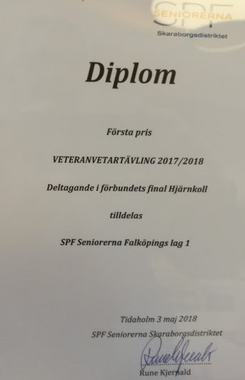 SPF Seniorerna Falköping kom tvåa i riksfinalen för veteranvetartävlingen "Hjärnkoll" 2016-2017.