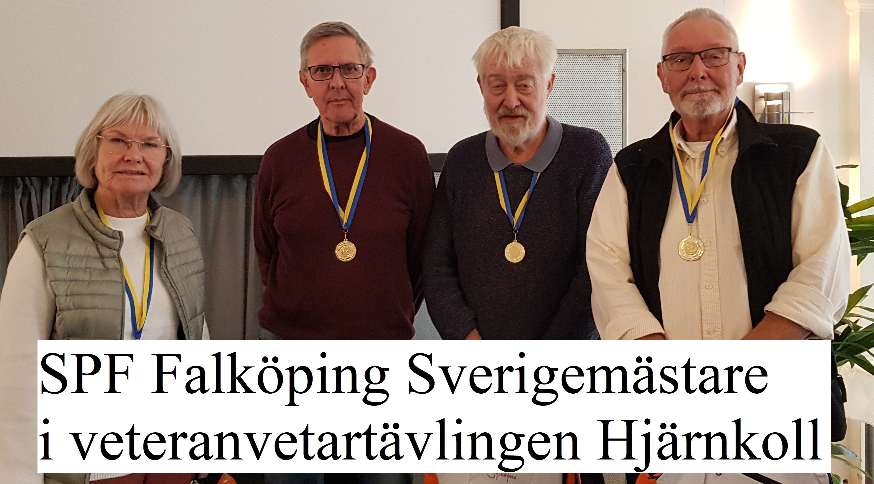 Idag 14/10 åkte vårt veteranvetarlag till Stockholm för att försvara titeln som regerande sverigemästare. 14 lag från övriga Sverige deltog. Laget bestod som vanligt av Lisette Friberg, Göran Svanberg och Lars-Göran Egneus. Kvalspelet började med 16 utslagsfrågor. Här startade Falköping med 13 rätt. Den som kom tvåa hade 10 rätt. Nio lag gick vidare till kvalomgång två. Poängen från första omgången räknades in. Nu låg vårt lag på andraplats. 5 lag gick vidare till Final. Alla lag startar om på noll. poäng. 16 frågor ingick i finalen. Började lite trögt för vårt lag. Låg sist efter 6 frågor. Då 12 frågor var avklarade låg vi en poäng efter Göteborg två poäng efter Värmland. På fråga 15 missade båda motståndarna samma resultat på sista frågan, vilket innebar att Falköping och Värmland låg lika. Utslagsfrågor fick tas till. Lagen följdes åt till 5:e utslagsfrågan där Värmland svarade fel. Efter en gastkramande final stod åter Falköping som segrare. Vilken prestation. Falköpings Spf kommer att åter igen få 5000:- i segerpremie. /Kjell-Åke Lind