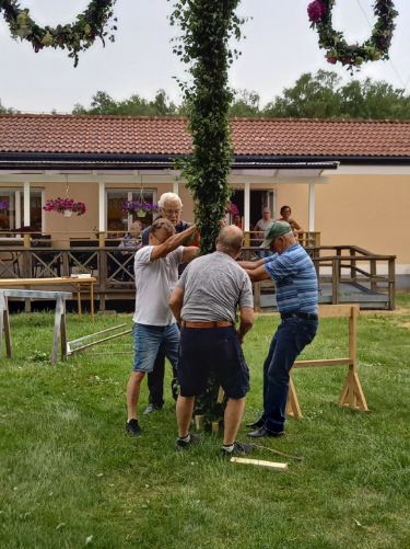 En träpinne skulle förvandlas till den vackraste midsommarstång i mannaminne. Regnet kom precis lagom när vi gick in under tak för att fika med de fina inneboende. Kaffe och frallor tackar vi personalen på Frökindsgården för.