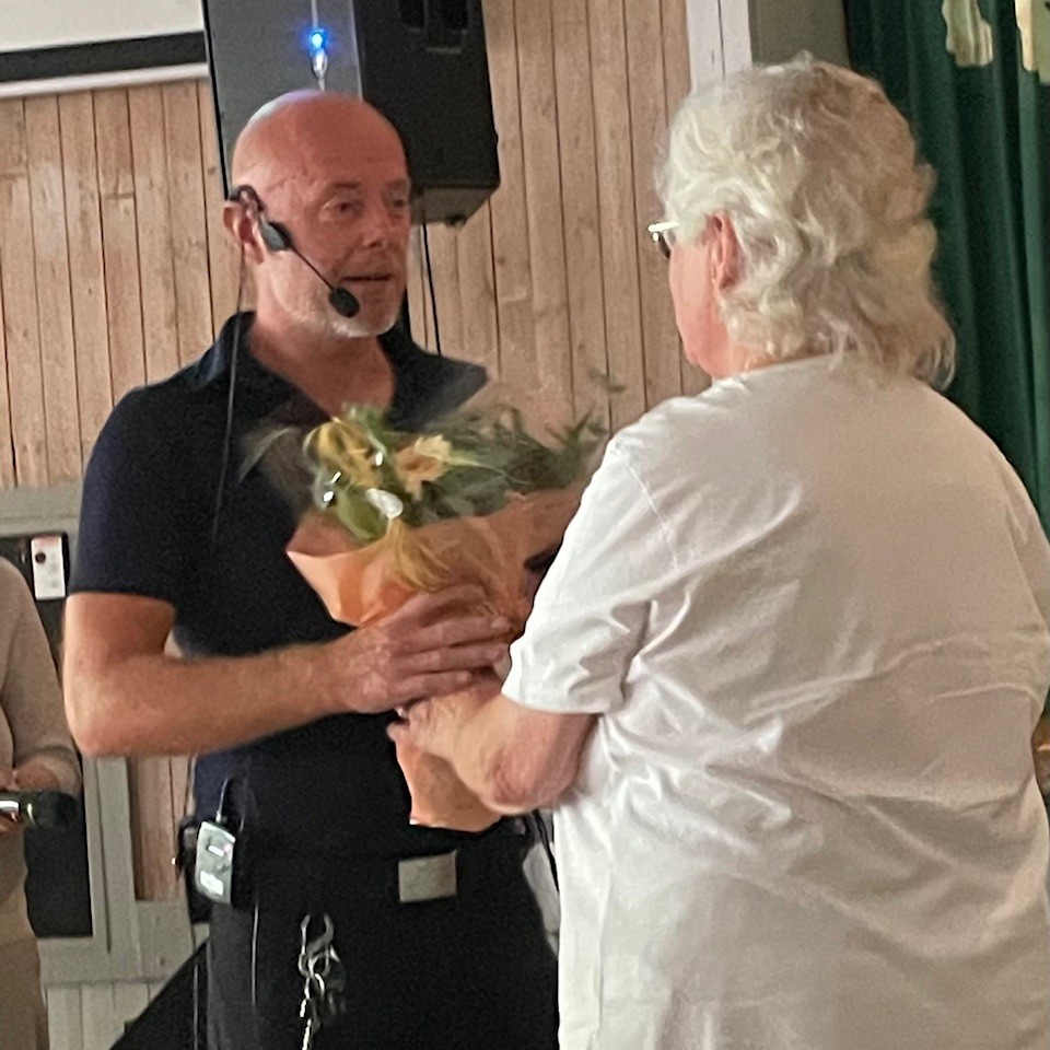 Thomas avtackades för ett intressant föredrag med en blombukett.