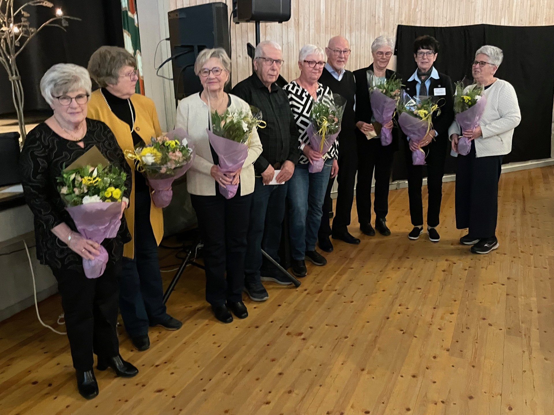 Avgående fr vänster: styrelsen Monica Persson och Mailis Karlsson, valberedningen Eva Sedwall, kaffekommittén Sture och Ewa Wallqvist samt Kent Algotsson, styrelsen Ritha Persson, kaffekommittén Ulla-Britt Algotsson och helgcafét Ann-Charlotte Blomstrand vilka samtliga avtackades med blommor.
