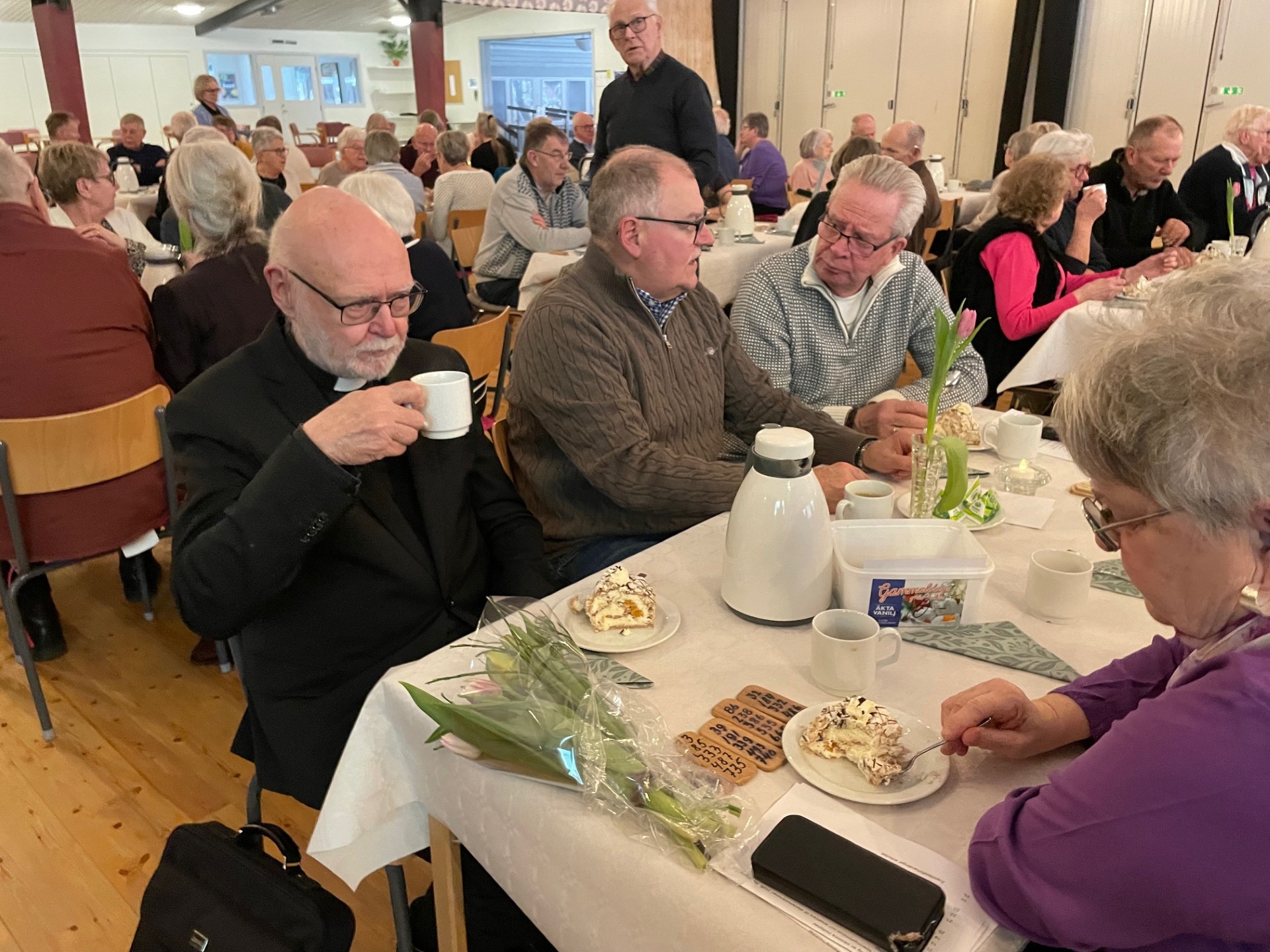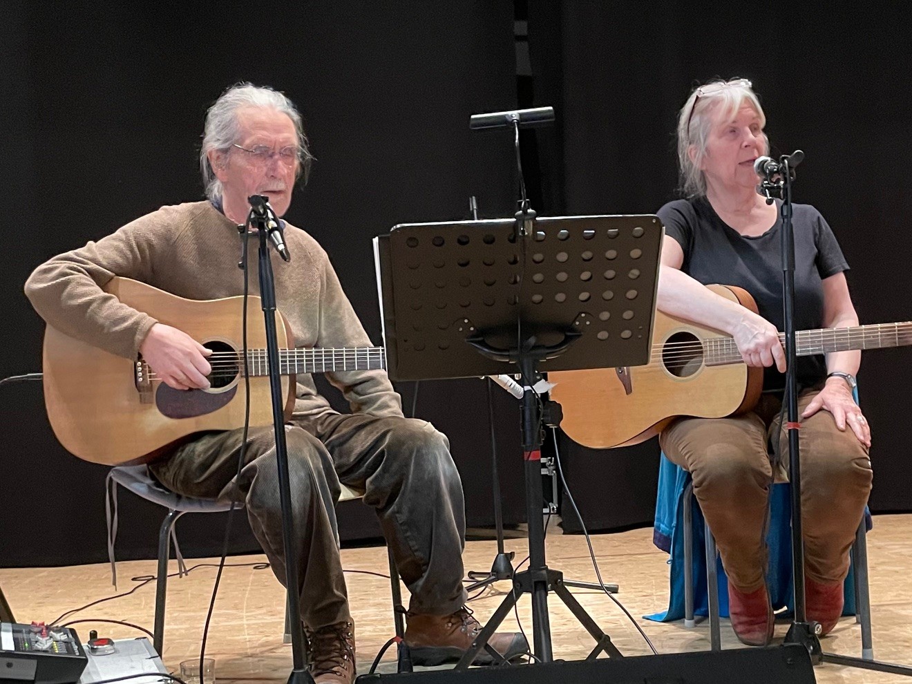 Efter kaffe och tårta så underhöll Eva Ekhagen och Roy Sällström. De framförde ett väldigt fint program, akustisk musik med doft av amerikansk folkmusik, egna och andra musikers sånger allt på svenska. Bl.a fick vi höra ett fint framförande av Gunnar Wiklunds ”Han måste gå” och också ”Leende guldbruna ögon” och andra visor. Alla i publiken bara njöt!