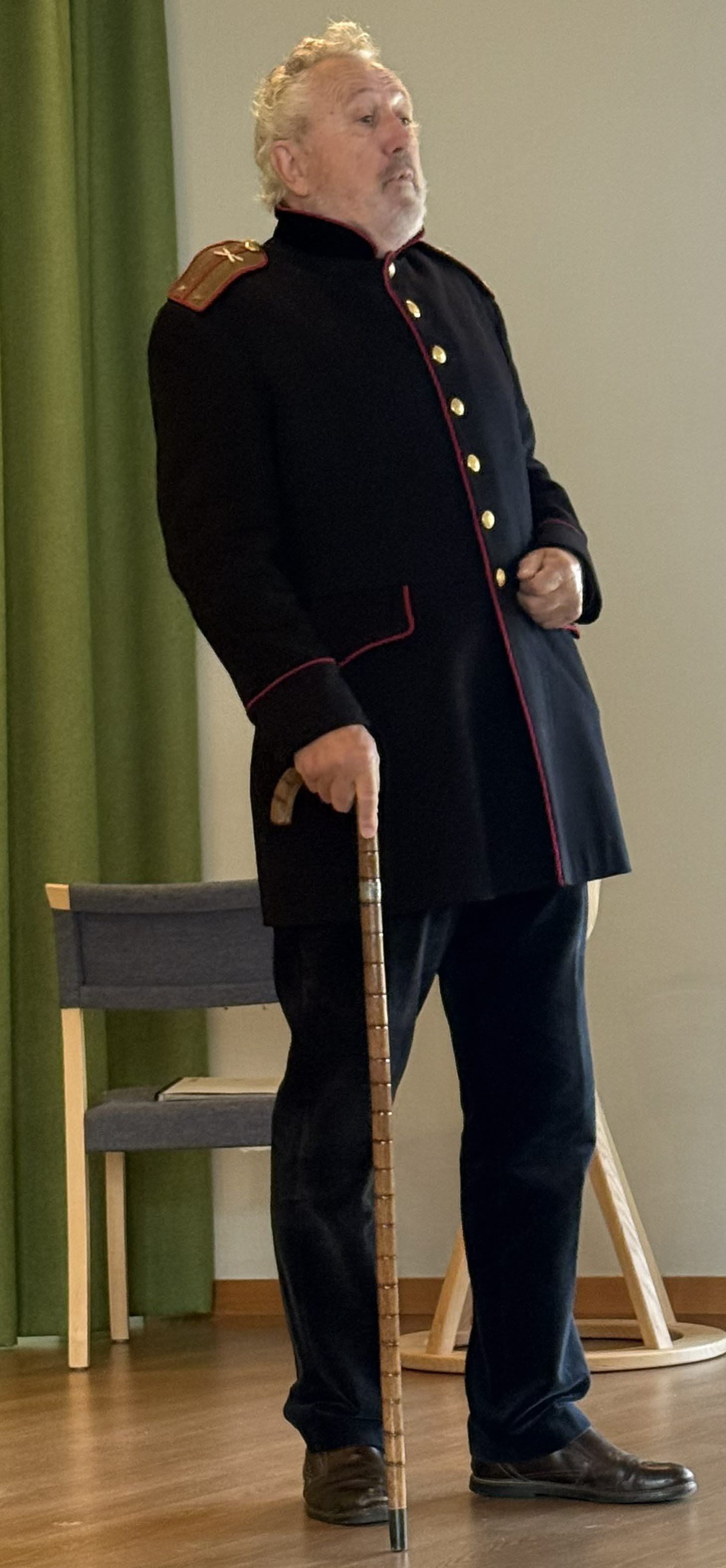 Till tonerna av marschmusik skrider han in i salen, lätt förklädd till Generalmajor.