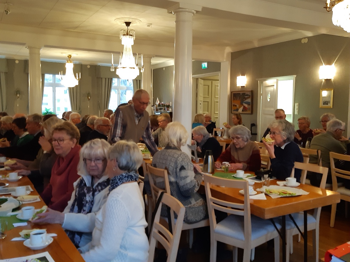 Egon Vikström hälsade välkommen till årets sista berättarkafé. Drygt 70 medlemmar hade samlats för att möta en hemlig gäst. Dagens gäst var Mats Blom från Mariestads begravningsbyrå.