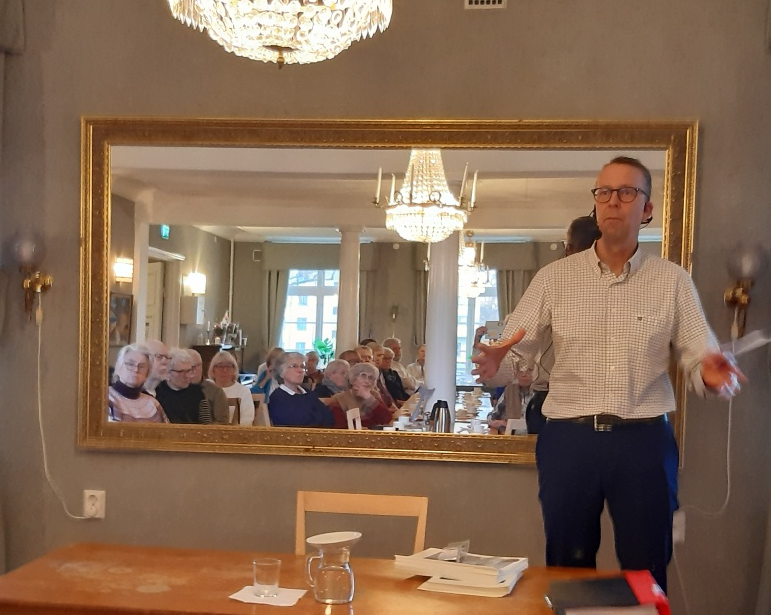 Egon Vikström hälsade välkommen till dagens berättarkafé. 50 medlemmar hade samlats för att möta en hemlig gäst. Dagens gäst var komminister Luka Westergaard som berättade över ämnet Den kreativa hermeneutiken.