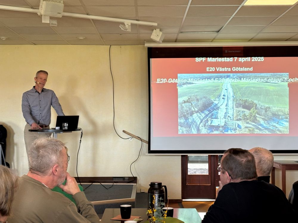 Dagens gäst var Håkan Sonesson som är projektledare på Trafikverket. Håkan berättade att ombyggnaden av E20 beror på att trafiksäkerheten och framkomligheten böhövde förbättras. Hänsyn vid stora vägomläggningar måste tas till natur, kultur, buller och markanvändning. Vägen kommer att vara mötesfri motortrafikled med mitträcke, två körfält i vardera riktningen med planskilda trafikplatser. Det är ett omfattande arbete med stora arbeten vid större avfarter och korsningar.
