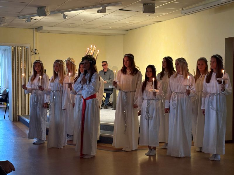 Strax därefter tågade Lucia in med ljuskrona och tärnor. Mats Pethrus hade med sig elva ungdomar från Ekhamraskolan, som framförde flera vackra julsånger. Den välkända Sankta Lucia väckte nostalgiska minnen, och de ungas klara röster – i både traditionella och nyare sånger – skapade en varm och stämningsfull inledning på julfirandet. Luciatåget tackades med varma applåder och en låda tomteskum.