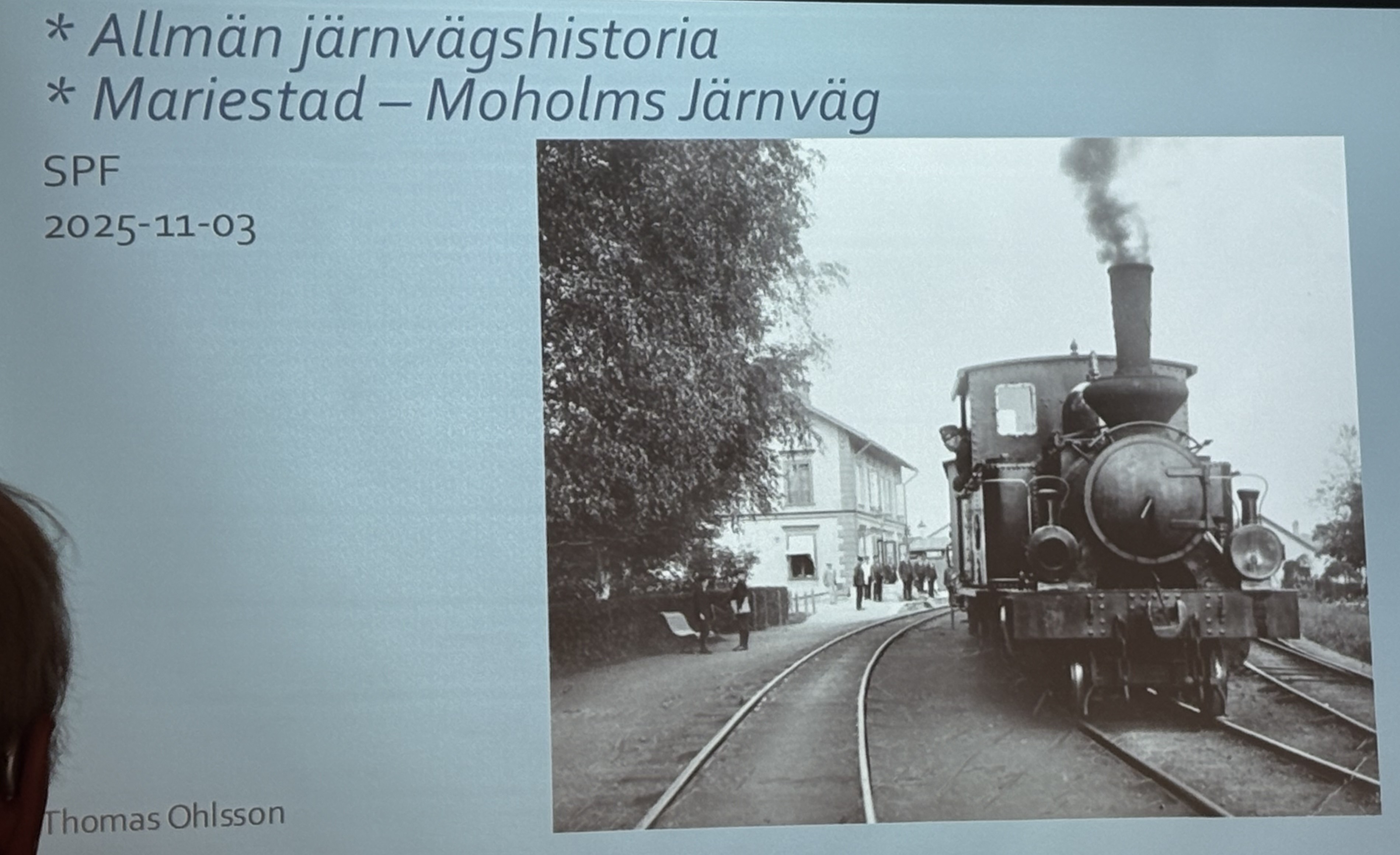 Dagens föredragshållare var Thomas Ohlsson, som berättade engagerat om Mariestad–Moholms järnväg. Järnvägen mellan Mariestad och Moholm kom till som en följd av att Västra stambanans sträckning hamnade längre österut än vad Mariestads beslutsfattare önskat. När SJ avslog Mariestads krav på att bygga och trafikera en bibana, fick privata aktörer tillsammans med landsting och kommun stå för finansieringen av en smalspårig bana.