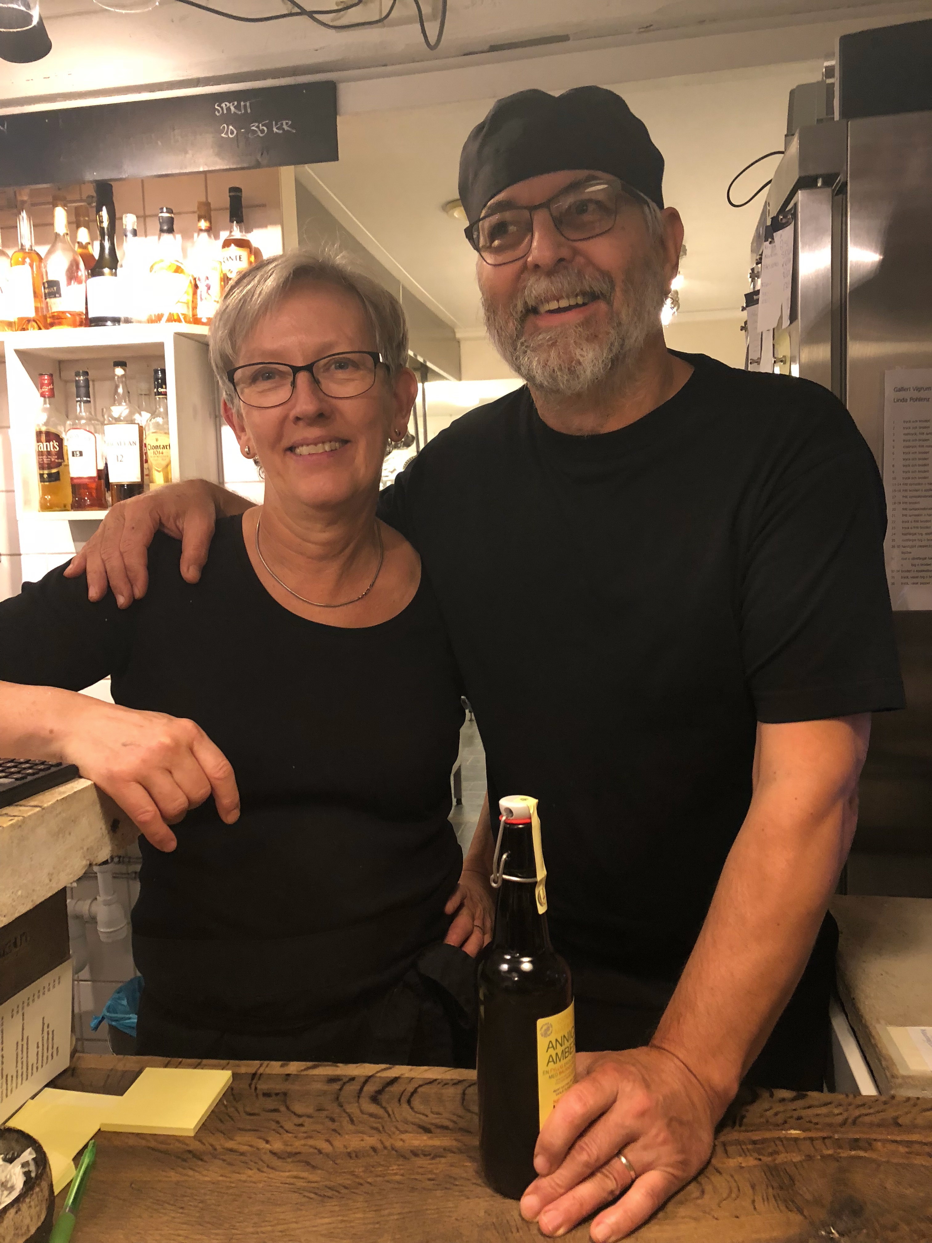 Nu när vintern börjar bita i skinnet drar sig pensionärerna från SPF N Härene/Hovby som traditionen bjuder in i Vigrums ladugård där förr Stjärna, Svea och Krona stod och tuggade i sig lass efter lass med hö. Men idag var det Lisbeth o Lars, Britt-Marie o Rolf och alla de andra pensionärerna som intog båset för en mycket välsmakande gulaschsoppa som dagens sopplunch bestod av, vilken Agneta o Tony trollat fram. Lyckan hade nu varit fullständig om inte detta trevliga värdpar berättat att de skall med ålderns rätt dra sig tillbaks och stänga Restaurang Vigrum. För att understryka allvaret i denna information tog som bilden visar Tony fram gravölen för restaurangen, som skall intagas på nyårsdagen då den är stängd för alltid, så här hjälpte inga böner. De har inga planer på att mata duvor i parken, för grenen med konstverk skall vara aktiv och all energi flyttas då från grytor till konsten. Vi önskar dem naturligtvis lycka till i deras skapande och utställning av sina alster. När vi efter att intagit lunchmenyn och andra ritualer med möte o.s.v. drog oss mot hemmets lugna vrå tänkte nog en och annan var tusan skall vi äta novembersoppan nästa år?