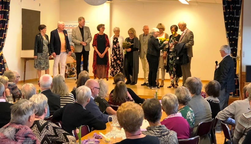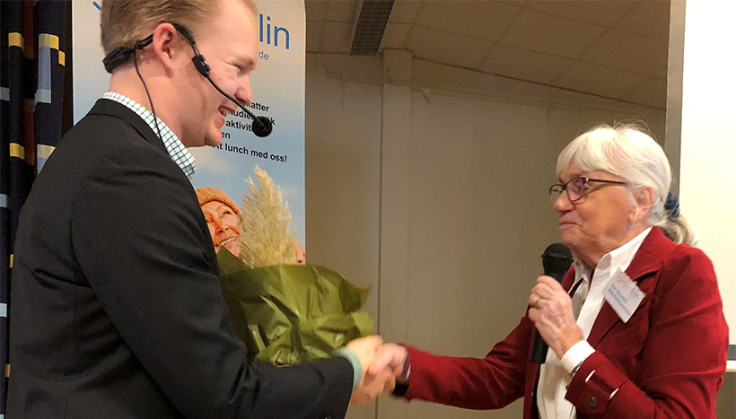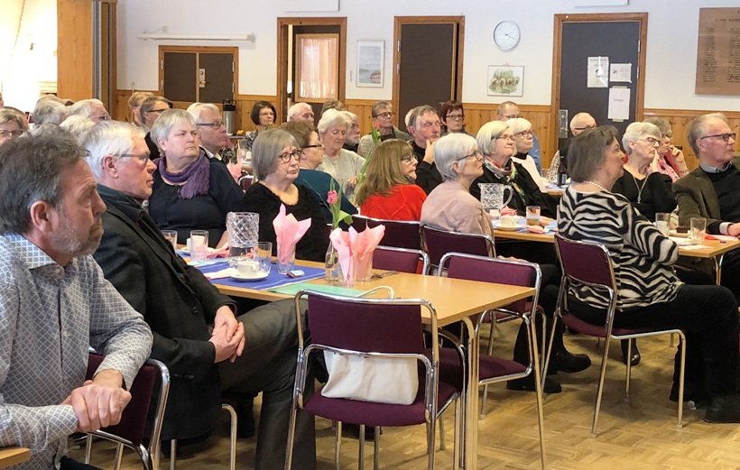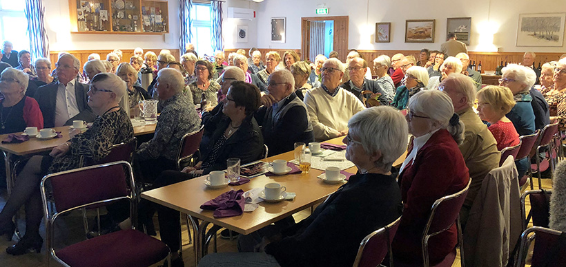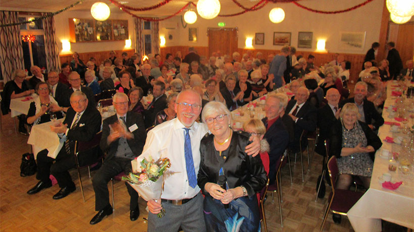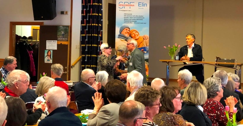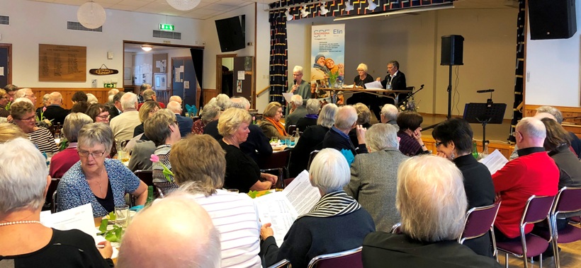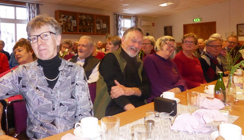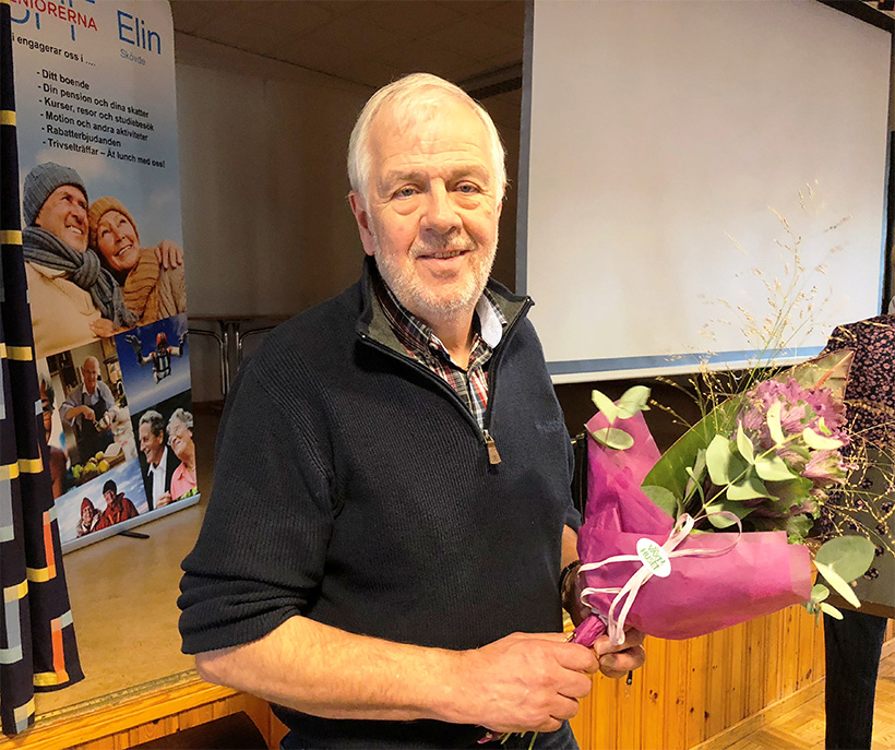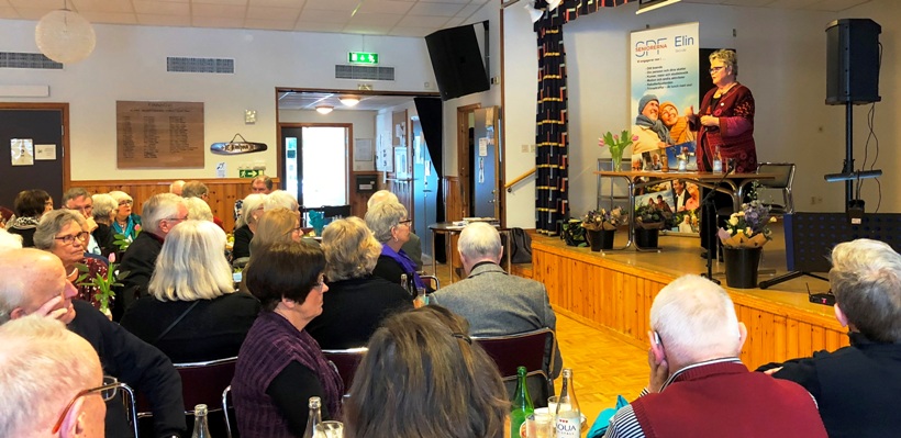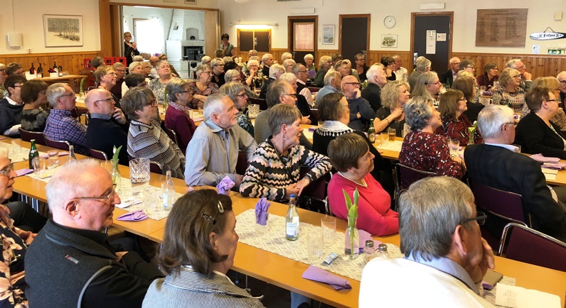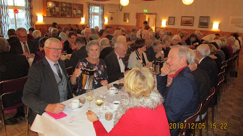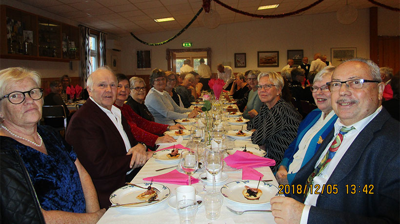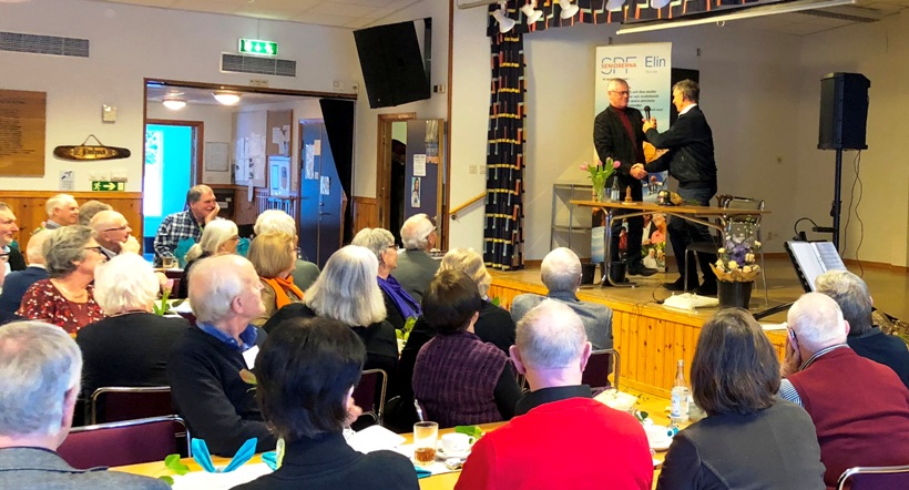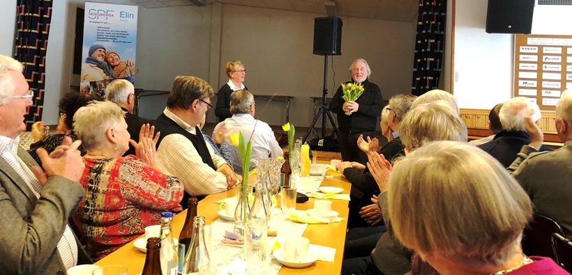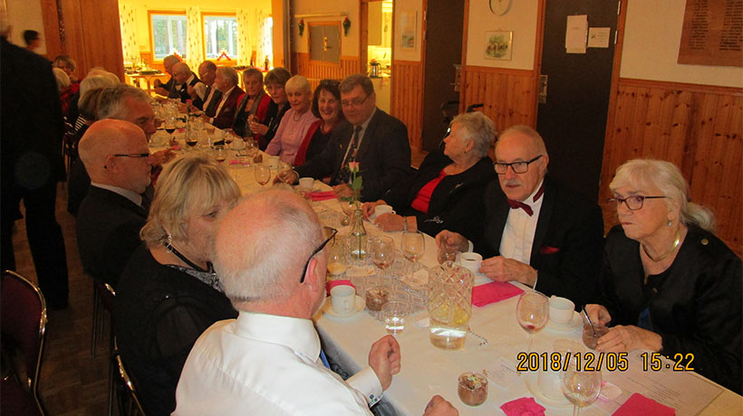 Då vi avnjutit desserten höll vår egen Rune Kjernald, styrelseledamot i Elin, ett tal med humor och hjärtevärme som manade till eftertanke. Han inledde med att tala om vikten att ta tillvara de festliga tillfällena i livet och glädjas tillsammans, men bad oss också tänka på de medlemmar som kanske sitter ensamma och skulle uppskatta ett telefonsamtal eller besök. I vår digitaliserade värld kan ett personligt samtal vara värdefullt. Kjernald avslutade med att låta oss känna hopp inför framtiden nu när det finns 15-åriga flickor som demonstrerar för en bättre miljö. (Greta Ernman, "Fredagar för framtiden").