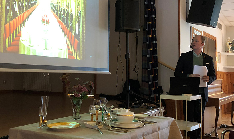 105 gäster besökte SPF-Elìn första höstträff och trollbands av ett alldeles högintressant föredrag framfört av Skövdesonen Henrik Fredriksson. Ämnet avhandlade Kungliga representstionsmåltider. Vi fattade inte hur kul detta kunde vara att höra om, men redan då Henrik presenterade sig ändrade vi oss. Han började på restaurang och hotellhögskolan i Grythyttan för att under fyra år studera till Ingenjör som måltidsformgivare, sommelierer och värdskap. Henrik ingår i Kungens stab av lakejer och är erfaren medarbetare på Stockholms slott, Drottningholm och i Stadshuset där kungen har sina representationsmåltider och högtidsmiddagar.