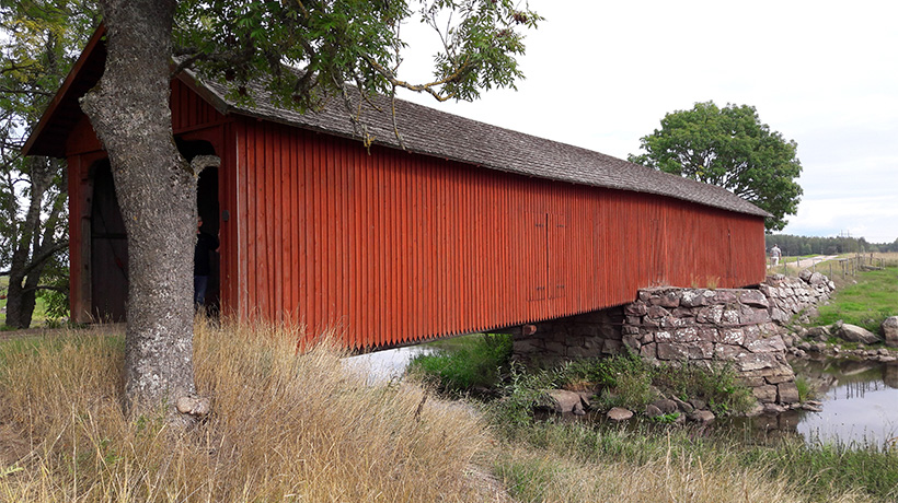 Sedan åkte vi till Vaholms bro, som sannolikt är Sveriges enda övertäckta bro. Bron ligger i en hängverkskonstruktion. Brohuset är rest i en enkel stolpverkskonstruktion och är fristående från brokonstruktionen. Bron var avsedd att sammanbinda godsets ägor på ömse sidor om ån Tidan. Den byggnadsminnesförklarades 2010.