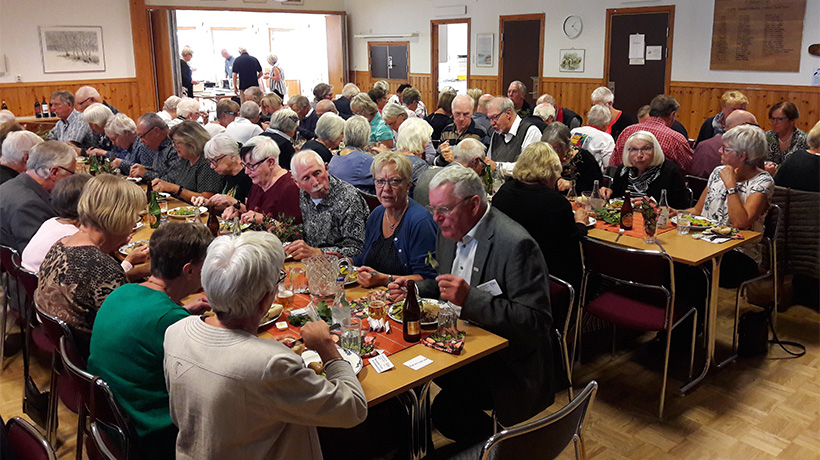 SPF SENIORERNA ELIN SKÖVDE höll sitt första medlemsmöte för hösten onsdag den 22 augusti. Ordföranden Bo Harder inledde med att hälsa alla 100 samlade medlemmar välkomna efter sommaruppehållet och gemensamt med programansvarige Stig Pettersson informera om dagens lunch och program. Lunchen som serverades bestod av fläskfilégryta med tillbehör och för den senare underhållningen svarade Lars-Erik Frendberg från Trollhättan för. Musiken och sången pendlade mellan visor och rock, med inslag av roliga och uppmuntrande historier av varierande slag. Mycket uppskattat. Efter underhållningen inledde Bo Harder med att berätta om vad som hänt under sommaren och kommande program. Vår medlem Rune Kjernald, tillika Distriktsordförande, lämnade också lite information, bl.a. om SPF:s två främsta uppgifter - Trivsamma träffar och Politikerpåverkan.