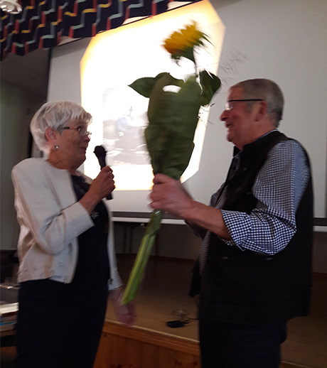 Researrangören Stig Karlsson och hans ekonomiske medarbetare Britt-Marie Eriksson hyllades också med blommor