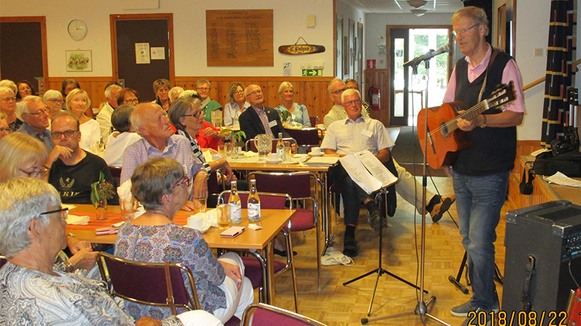 SPF-Elins halvårsavslutning på onsdagen lockade till fullt hus i den lövade lokalen. Om det var den härliga grillbuffén som lockade mest eller vår lokala och mycket uppskattade trubadur och vissångare gitarristen Jan-Olov Andersson från Tidan, spelar egentligen ingen roll. Båda får ta kredit. Alla skulle nog uppskatta ingredienserna igen vid annat tillfälle. Jan-Olovs beskrivning av sin bakgrund, sitt avundsvärda sätt att på ett naturligt sätt forma texter och musik till en helt igenom uppskattad presentation, var njutbar till alla delar. Livet har fått många guldkorn på grund av både talang, skicklighet och tur, mest tur, menade han. Vi andra ansåg nog att talangen stod främst. Som när han som ung tonåring fick åka med Bert Karlsson till Nalen i Stockholm. Det var långa köer vid entrén, men med Bert i täten stegade de fram till vaktmästaren och sa. Ursäkta att vi är lite sena, men nu är vi här!De blev kvar i tre dar och Jan-Olov fick vara med och lira lite med Dompan och de andra. Lite tur skadar ju inte.Sedan blev det utbildning i både Göteborg och Stockholm och en lysande karriär med närkontakt med alla av våra stora visskapare och vissångare.