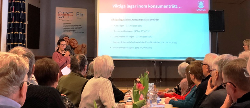 Efter lunchen redogjorde Mimona Pettersson, Helen Bergström och Camilla Wahlin, från Budget- och skuldrådgivningen och Konsumentvägledningen, om vad som gäller när vi som konsumenter inhandlar en vara eller en tjänst från en näringsidkare. Reklamera kan vi göra i tre år. Avser det en fastighet är det tio år. Under garantitiden, som minst är sex månader, behöver vi som konsument inte bevisa att felet fanns från början. Näringsidkaren har rätt att först försöka avhjälpa felet. Lyckas inte det får konsumenten häva köpet och få pengarna tillbaka. Konsumentköplagen är en tvingande lag som inte kan avtalas bort. Allmänna Reklamationsnämnden tar upp anmälan från konsument som vill anmäla en näringsidkare som inte följer de bestämmelser som finns.