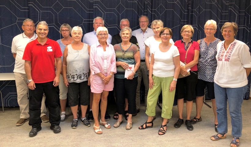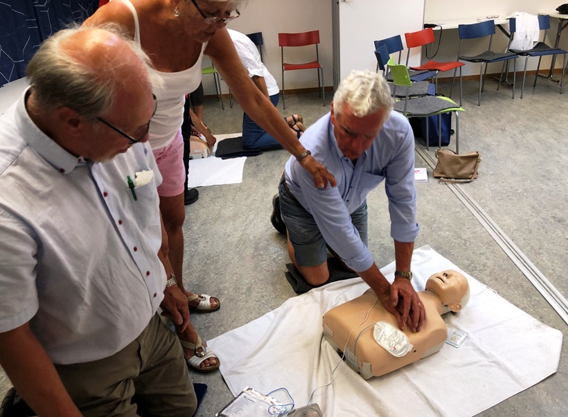 Utbildare var Röda Korsanställde Iraj Mirshahi som med varsam hand och sammetslen röst hand- ledde pensionärerna att hantera svåra nödlägen med särskild tonvikt på hjärtstopp och användandet av hjärtstartaren. Med stort engagemang lärde man sig ta hand om olika situationer och även om ämnet var allvarligt fanns många tillfällen till skratt. Och nu kan man använda hjärtstartaren, det fick man papper på.