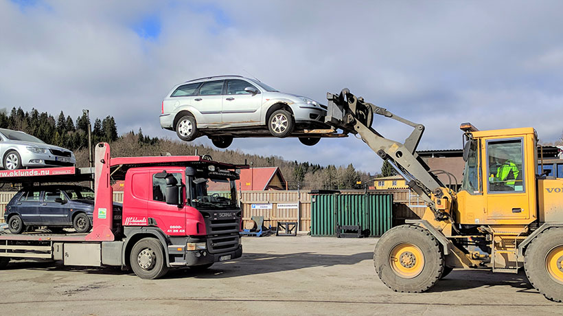 Örjan tog oss med på en rundtur där vi såg hur bilarna kom in. Vi såg hur de lossa-des och hur de sedan tömdes på miljöfarliga vätskor. Man dokumenterar samtlig for-dons status genom att tömma bilens dator. Därefter görs en bedömning av vad som kan demonteras för att säljas. Det som inte blir reservdelar såsom koppar, stål och glas, sorteras och går till återvinning.
