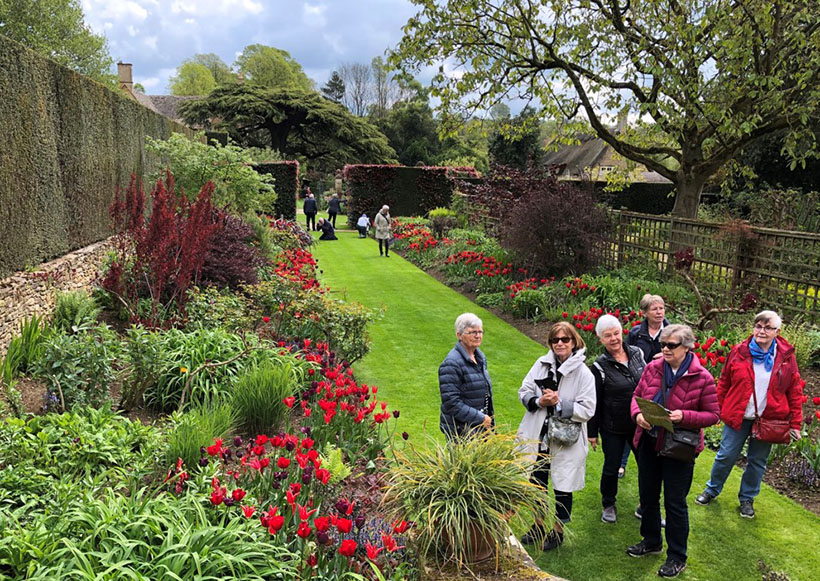 Dag två möttes vi av en fantastisk engelsktalande guide som med hjälp av vår egen pålästa Ingrid gav oss en totalbild av underbara Costswolds. Detta är ett område av kuperad terräng "åsar" som 1966 fick utmärkelsen "Area of outstanding beauty" vilket vi helt instämde i. Gammal fin kulturbygd från 1100-talet med olika byar där konstnärer och skådespelare levt genom generationer. Vi fick också lära oss hur mycket fårskötseln och ullen betytt för området. En rolig detalj fick vi ta del av i Stanton, där vissa byggnader pryddes av olika djur på takåsarna. Detta är en symbol för att bygget är gediget och "skatten är betald". Så småningom nådde vi dagens huvudattraktion Hidcote Gardens. Denna fantastiska trädgård skapades av Lawrence Johnston, amerikan, och hans mor som köpte Hidcote Manor 1907. När Johnston kom hem från sitt deltagande i Boerkriget 1910 såg han en möjlighet att göra om de stora fälten till en trädgård och 1920 hade han tolv heltidsanställda.