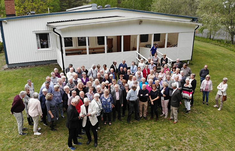 Efter att ha avnjutit en god lunch vid vackert dukade bord, beordrade vår ordförande, Bo Harder, brandövning. Alla 108 personer visades snabbt ut genom olika dörrar för att återsamlas på gräsplanen utanför Finnhovi. Många glada skratt hördes då det stod klart att syftet var att bli fotograferade av en "drönare". Vi fick återvända inomhus och styrka oss med kaffe.