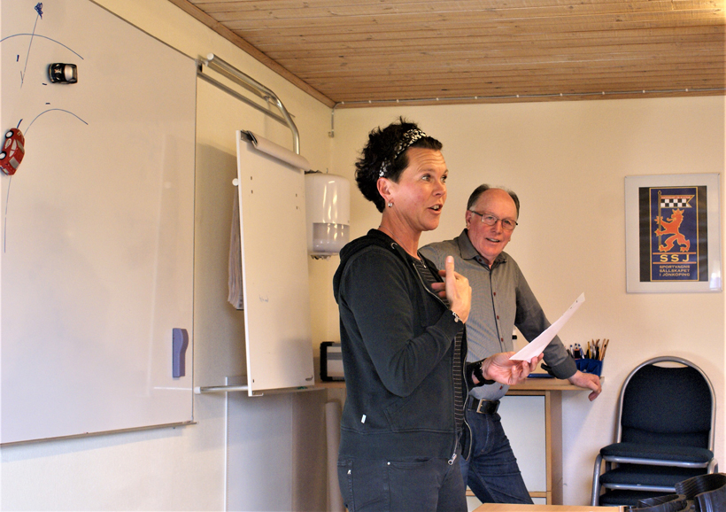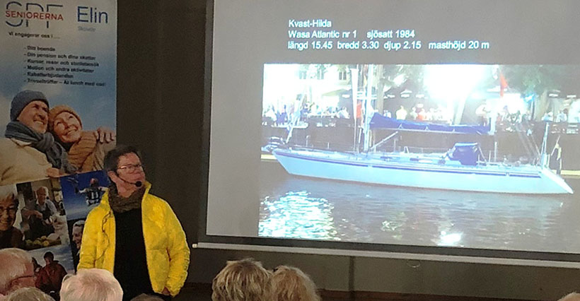 Gunilla Olsson och Toyvo Stark från Karlsborg presenterade sedan sin segelbåt "Kvast-Hilda" för oss. En båt som de köpte in 1999 och sedan utrustat till att kunna fungera som ett hem för dem. De har gjort många långresor runt Europa bl.a. vistades de från 2009 i Adriatiska havet, Italien och Grekland. 2011 återvände de hemåt genom att segla i konvoj till Libanon och Egypten och därefter genom Europas floder tillbaka via Holland för att komma hem till Karlsborg 2012. År 2013 fick Kvast-Hilda vara fånge i Vättern, men redan 2014 väcktes seglartankarna igen och det blev en tur till Geiranger i Norge. 2015 seglade 7 båtar i konvoj till Vita Havet i Ryssland via Onega, Stalinkanalen. Där upplöstes konvojen och Kvast-Hilda fick ta sig i ensamt majestät runt Kolahalvön, där man inte hade tillåtelse att gå i land. Resan tog 3 dygn och 17 tim då Gunilla och Toyvo arbetade i tretimmarspass i hård sjö och strömt vatten. Paret levde på frystorkad mat och flytande kost. Lyckan var stor när man nådde norskt vatten.