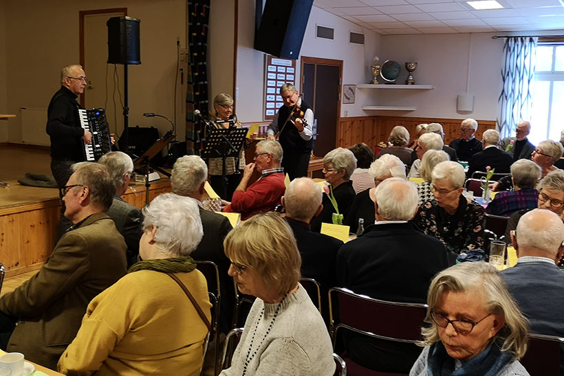 Efter kaffe och kaka som serverades vid de vårligt, färgglatt dukade borden tog dagens underhållning vid. Jan Ejdebäck, fiol och Christer Kempe, dragspel bjöd på vacker musik under temat "Kärleken". Jan Ejdebäck underhöll med trevligt småprat runt temat och vad musiken kan betyda i detta avseendet. Ingan Bergström ledde allsången och den uppskattade underhållningen avslutades med "It´s time to say goodbye" och den finstämda "Koppången".
