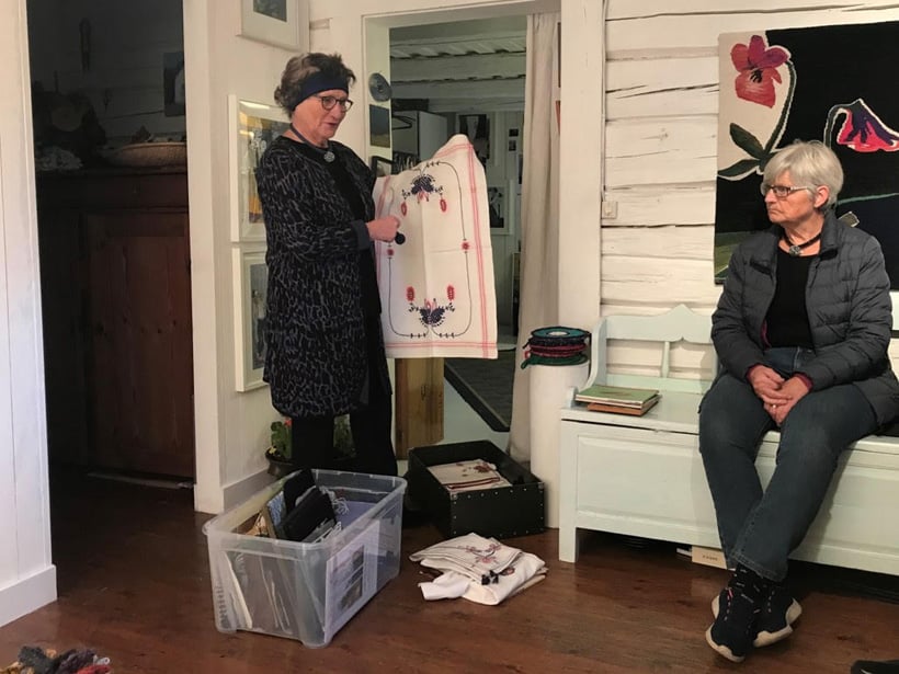 Vi fick en inblick i hur man spinner med slända, färgning av garn, skapande av pärlbroderier och olika bildvävar.