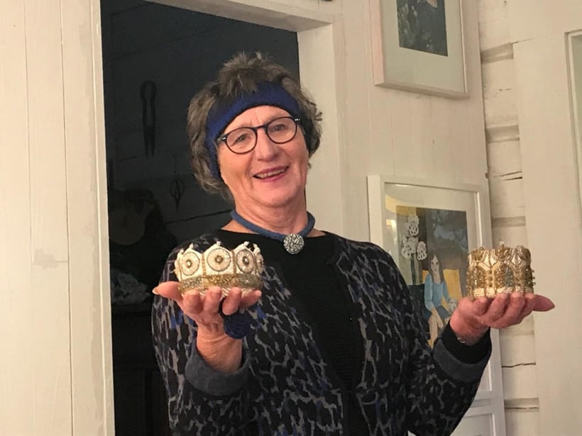 Annette har ritat av gamla broderier från ordginalen och bevarat dem för framtiden för Skaraborgs läns hemslöjd. Lite kuriosa, hon gjorde även ett mönster och stickade upp en Skövdemössa och vantar till det intressanta SM som fick skjutas upp flera år under tiden Skövde väntade på snö.