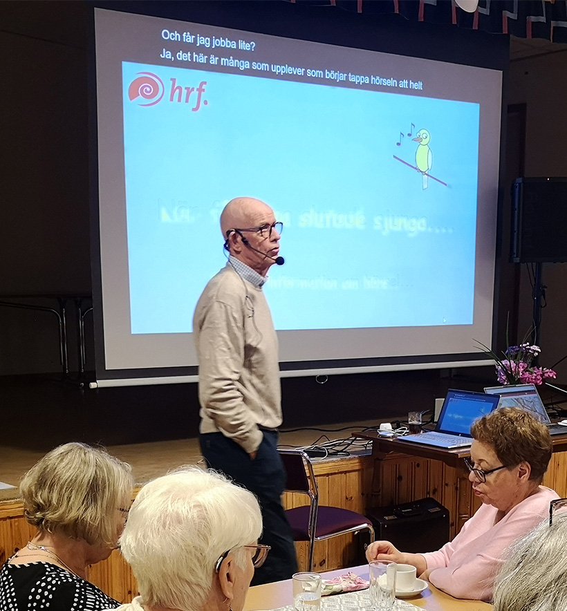 Efter en välsmakande lunch var det dags för dagens föreläsare Janne Åberg från Hörselskadades Riksförbund att äntra scenen för att informera om dålig hörsel och sin karriär inom fotbollsvärlden.