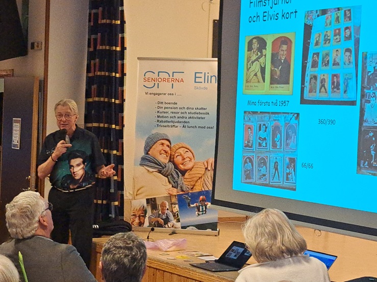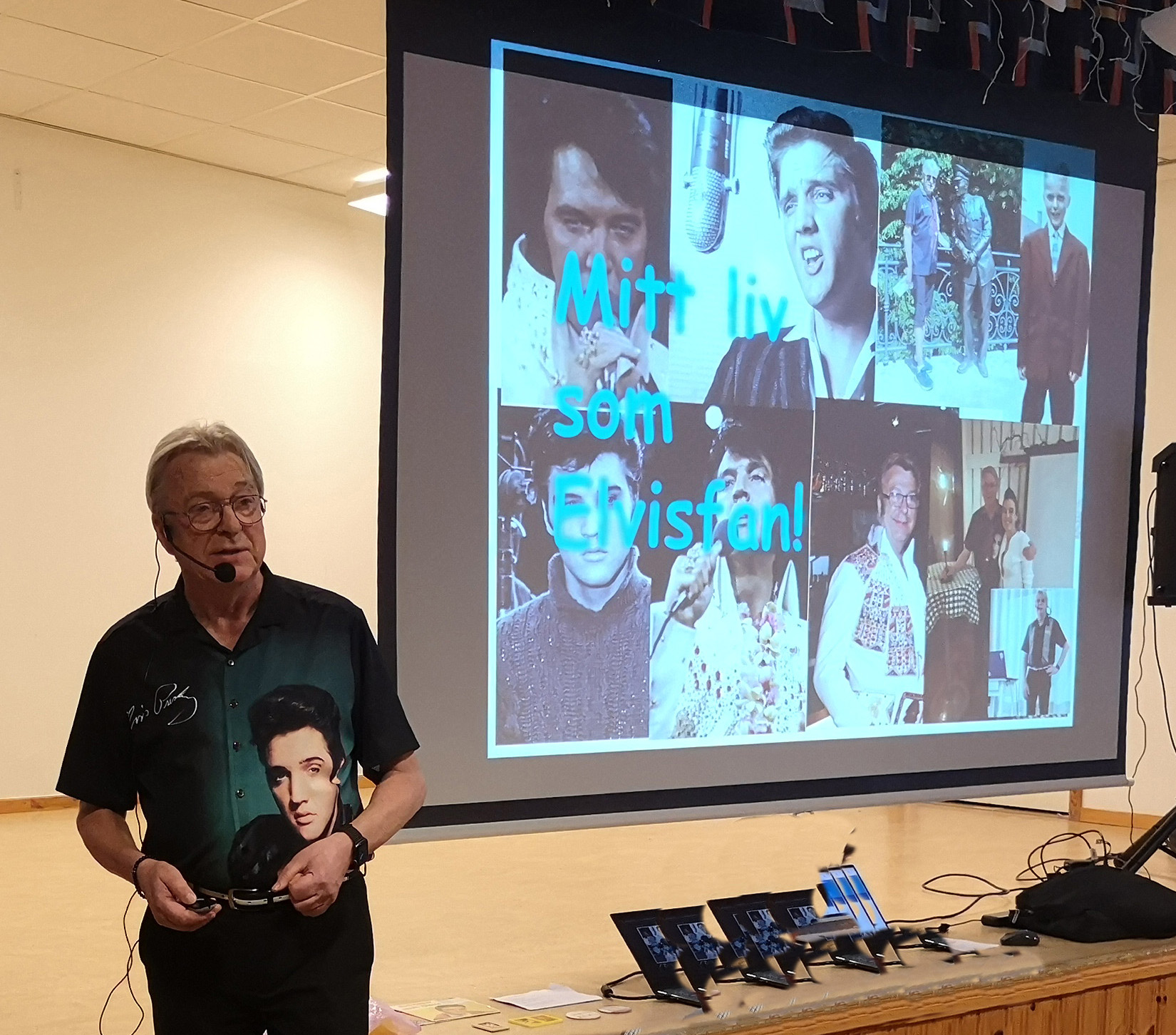 Efter en god lunch berättade ”Stickan” på ett mycket engagerande och underhållande sätt om det han kallade ”Mitt liv är Elvisfärgat”. Han delade med sig av minnen från många besök på Graceland samt möten med personer ur Elvis närhet, varvat med inspelningar av Elvis låtar – musik som är kultförklarad av många.