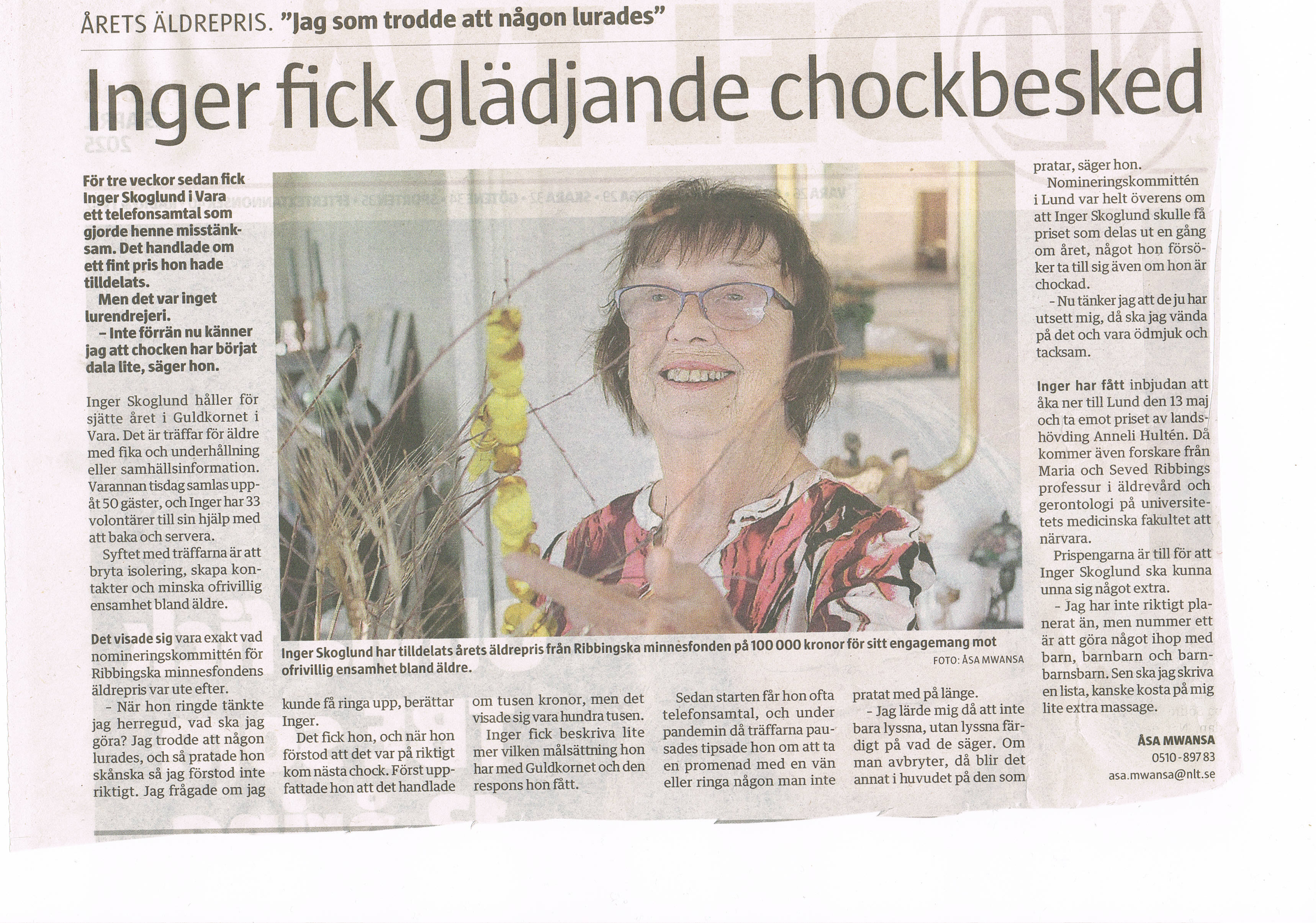 100.000 kr från den Ribbingska minnesfonden går till Guldkornet som drivs av SPF Seniorerna Vara. Guldkornet är en träffpunkt för äldre som erbjuder fika, underhållning och samhällsinformation.