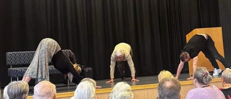 I måndags hade vi månadsträff och vi var över 150 personer anmälda. Stefan Odelberg gav oss många härliga skratt och han bjöd verkligen på sig själv. Rosey kommer att delge oss mer information i hennes referat framöver. Sofi Älvskog visade oss yogaövningar som vi kan göra på stolen hemma. Till slut gjorde Sofi, Stefan och vår egen yogamästare Håkan den omtalade HUNDEN. Vad vi hörde efteråt var hans funderingar över hur han skulle komma upp från denna ställning.
