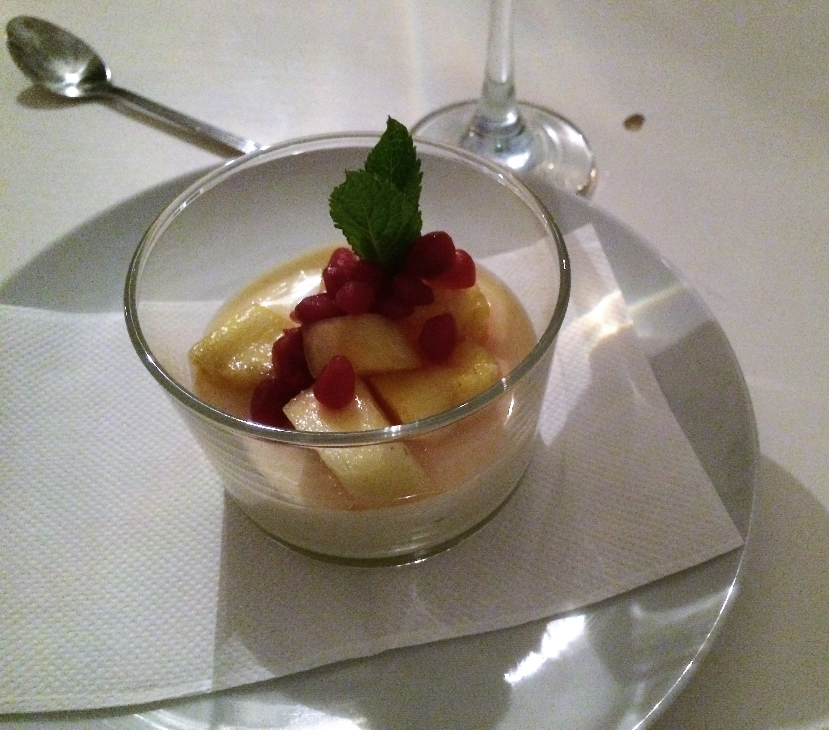 Träffen började som tidigare med mingel i restaurangens bardel. Därefter satte sig 37 st medlemmar till bords för att avnjuta den väntande trerättersmenyn. Denna inleddes med en klassisk Toast Skagen toppad med löjrom. Denna följdes av huvudrätten bestående av vitvinspocherad rödtunga med havskräftsås och potatisbakelse. Till dessert serverades en limepannacotta med rommarinerad ananas och granatäpple.