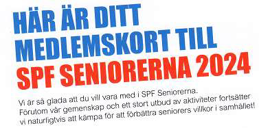 Tidigare år har medlemskorten bifogats tidningen Senioren. I år blir det inte så. Du kan hämta ut ditt medlemskort på expeditionen Torggatan 13. Den är öppen torsdagar mellan 10 och 12. Vi delar också ut medlemskort vid våra månadsträffar.