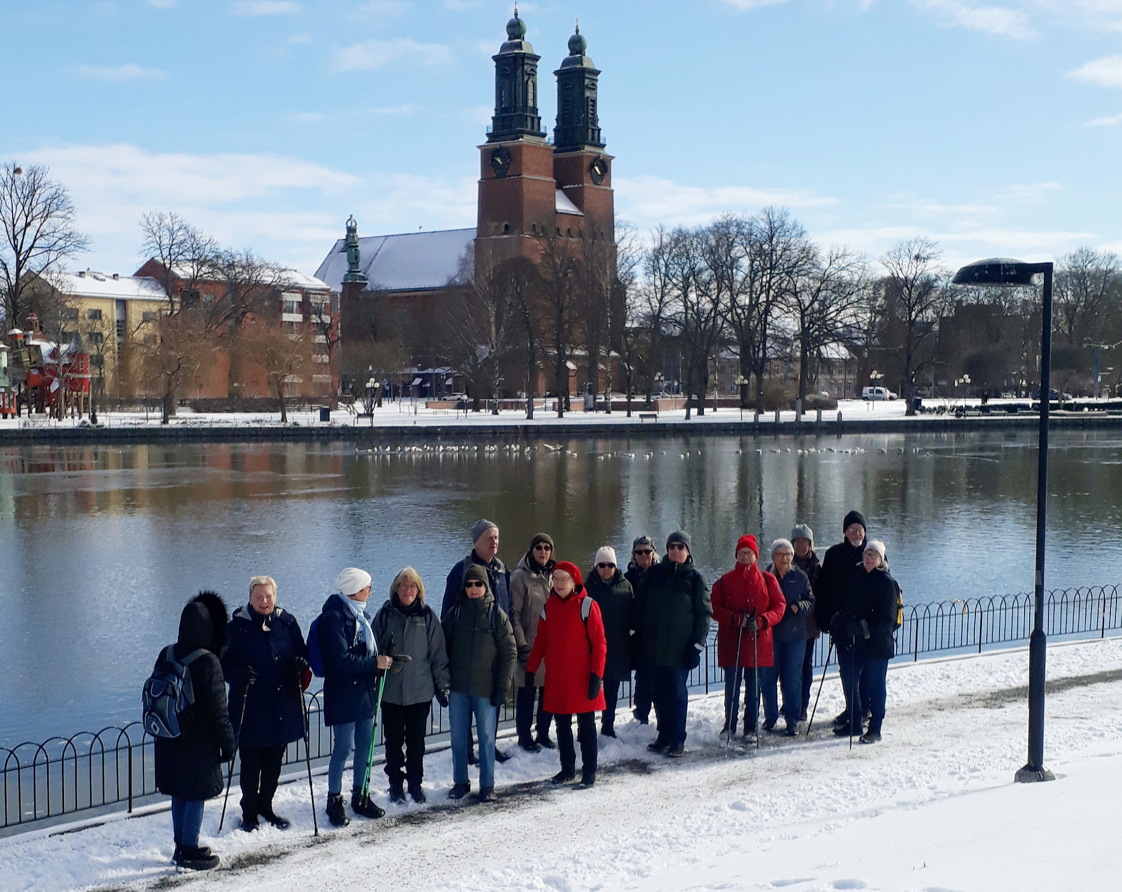 Den alternativa vandringen i staden, när skogen kändes oförsvarligt osäker med snöhalka med mera. Från Sveaplan ner till ån, där mängder av fåglar vistades: änder, knipor, skrake, olika måsar och fem svanar såg vi. Vidare uppströms och över Stålforsbron, och vi stannade till vid Tunafors, beundrade byggnaderna och det forsande vattnet med en del isbildningar. Därefter följde vi ån förbi den lutande Fors kyrkan, genom Hamnparken och runt Strömsholmen. Vi passerade Stadsmuseet till Rothofsparken, där vi förtärde matsäcken.