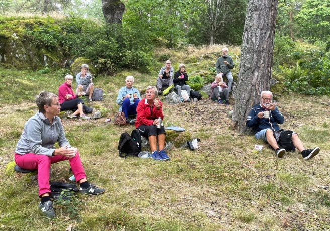 Så härligt med den helt nödvändiga fikastunden efter motion och lärorika berättelser. Frilufsarna slog sig ner strax nedanför Sigursristningen. Foto: Roger Stark