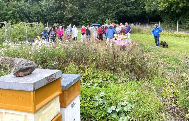 Frilufasrnas promenad blev lite kortare än normalt, men informationen vid Ramsundsäppelodling blev mycket uppskattad. Det blev till och med svårt att slita sig för den, trots allt, helt nödvändiga fikastunden. På promenaden deltog 22 tvåbent medlemmar och två godissugna hundar. Direkt till äppelodlingen tillkom ytterligare några Frilufsare som för dagen fått dispens från att vandra. Äppelodlingens Patrik Andersson berättade kärnfullt om fruktverksamheten och Inger Kullberg satte oss in i en del av livet i en bikupa.