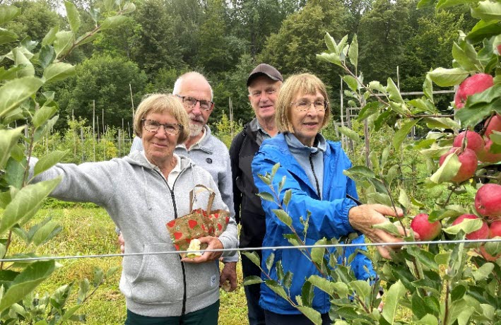 Katjaäpplen direkt från träden. De som glatt tar för sig är Sirkka, Karl-Axel, Bert och Maj-Britt.
