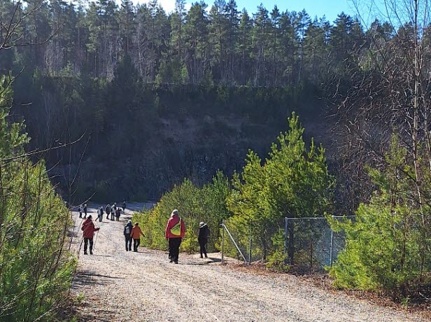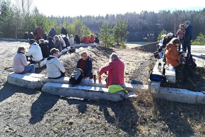 Från kyrkogården gick promenaden vidare i ett härligt skogsparti. Raden av Frilufsare blev lång och samtalen blev många. Efter en bit även på asfalt och grus kom vi fram till den konstgjorda sjön, som uppstått när stora mängder sten brutits till byggande av vägar och hus. Nära sjön hittade vi platser att fika vid.