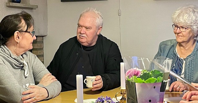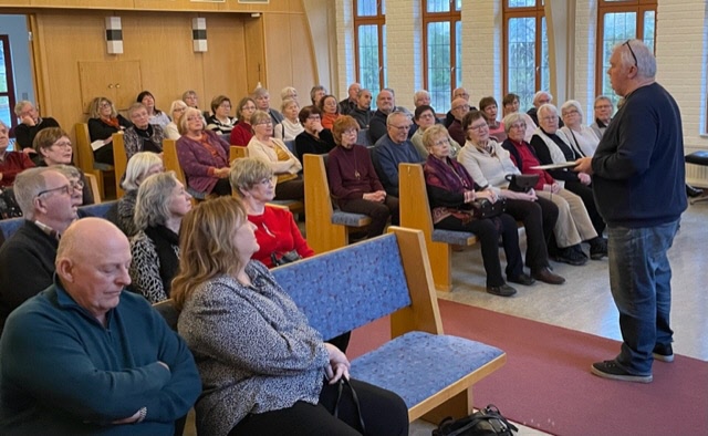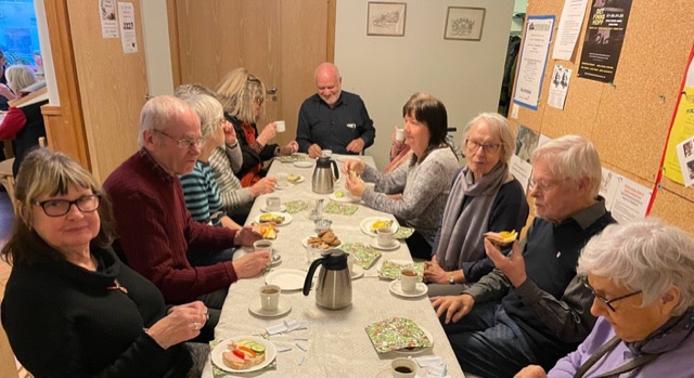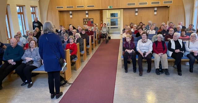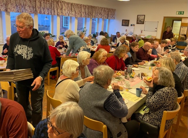 När sedan de drygt 90 seniorerna som lyssnat uppe i kyrkans hörsal sedan skulle få sin efterlängtade fikastund, så blev det trängsel kring kaffeborden och det hade t o m dukats upp långbord i korridoren. Våra duktiga tjejer i köket fick det hektiskt med att breda smörgåsar och koka kaffe idag när man såg hur många vi blev.