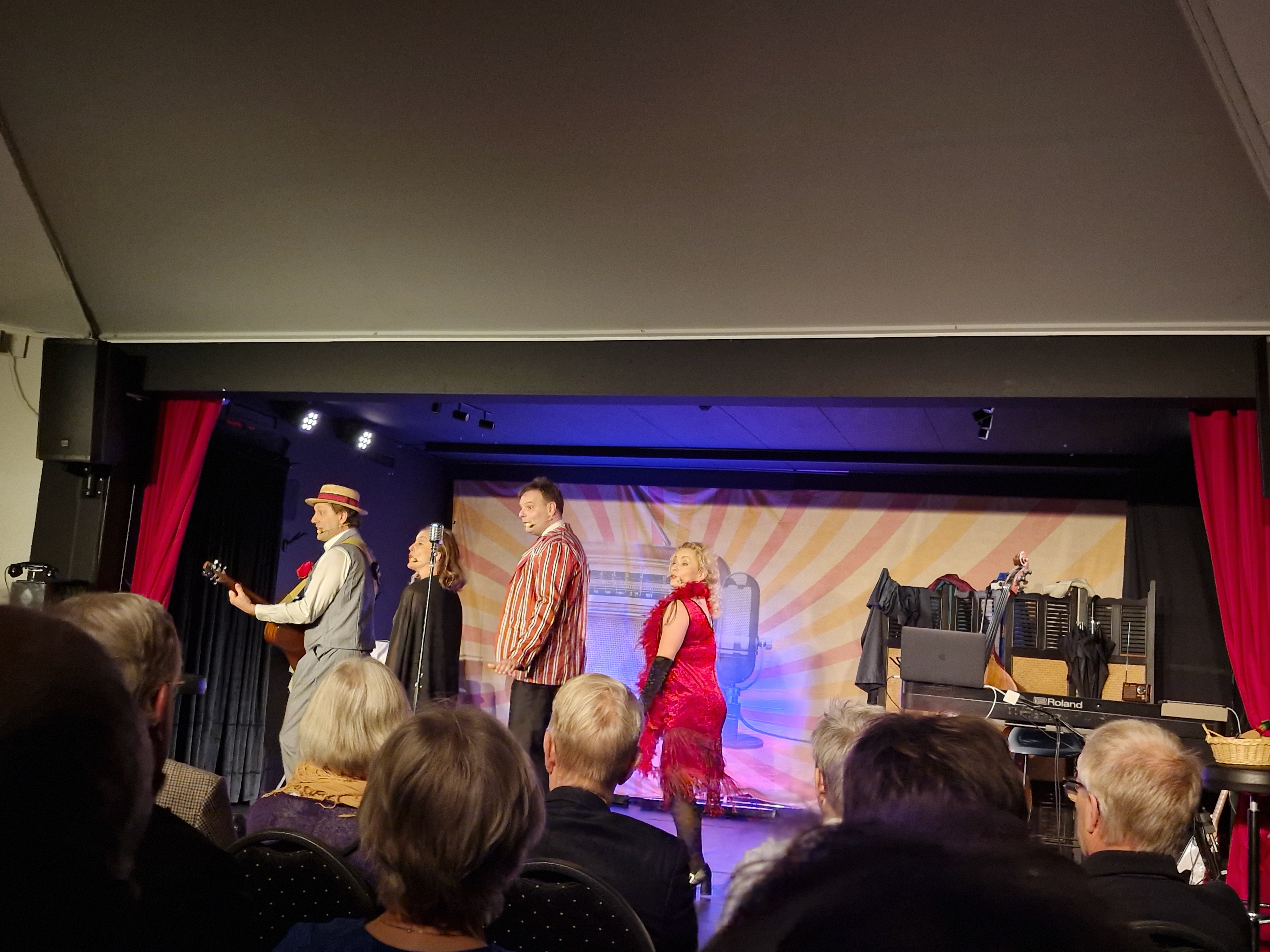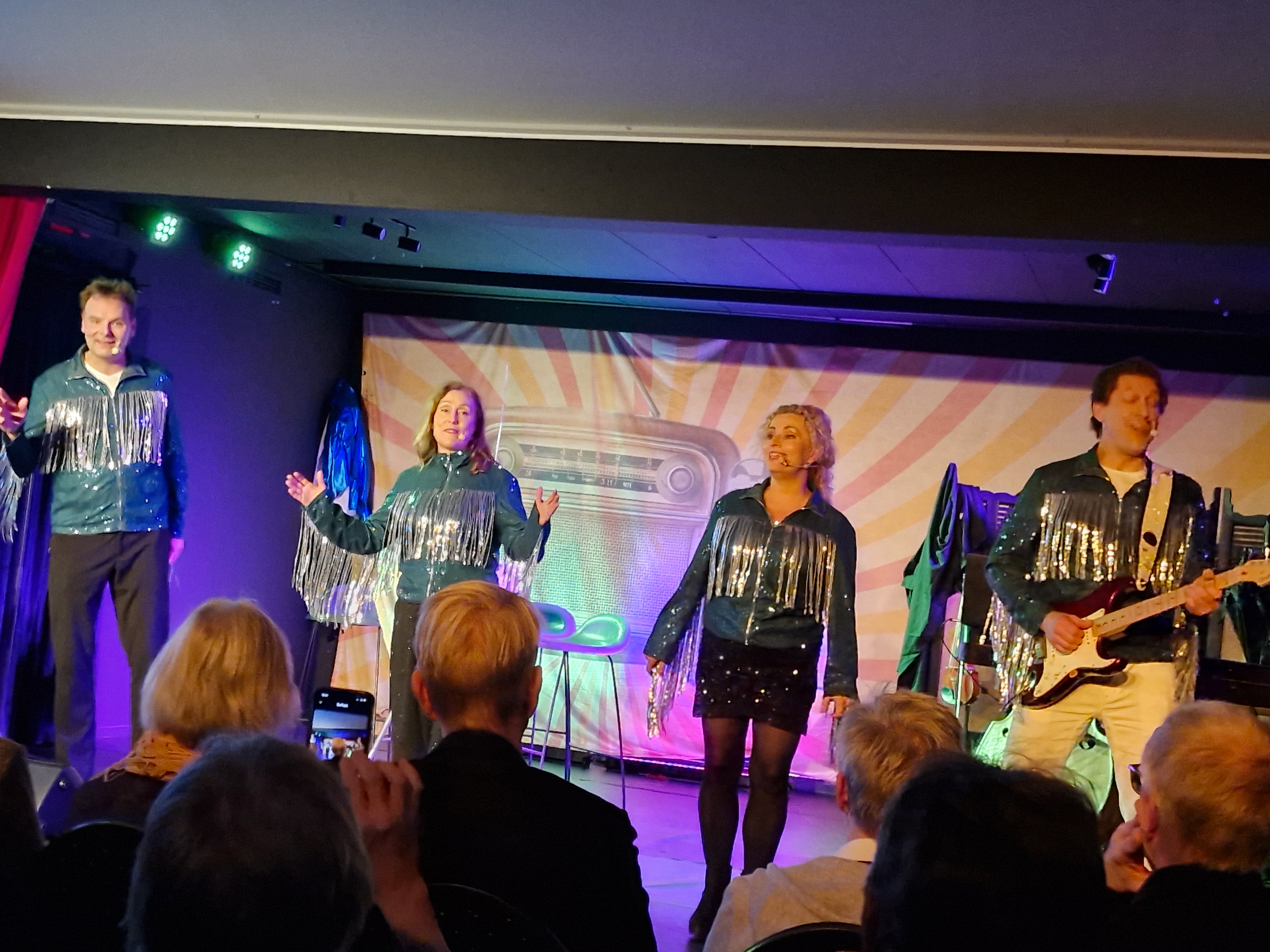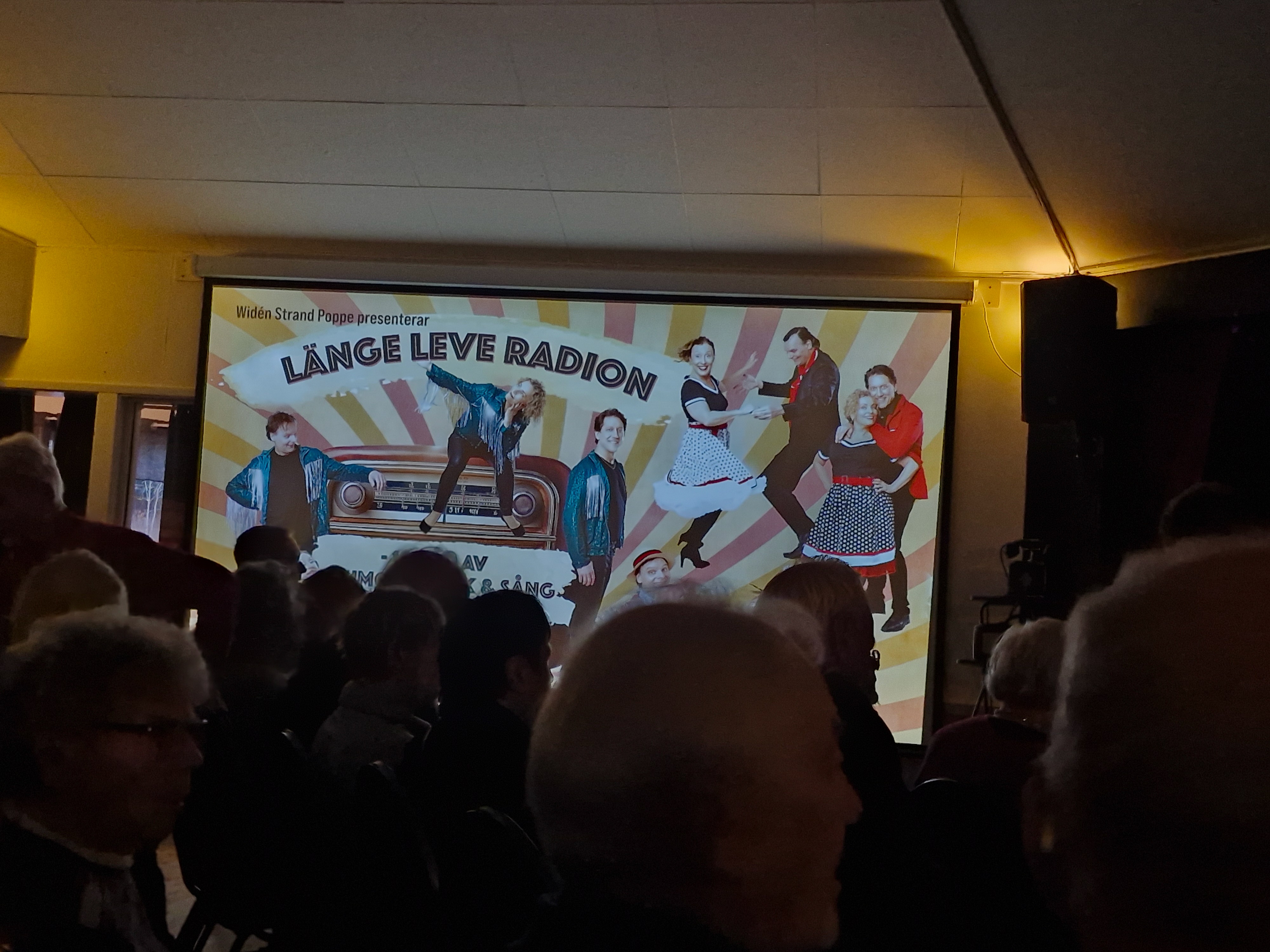 Med bussen fullsatt till sista plats, bar det av till Vingåkers Folkets Park. Efter att vi ätit en god måltid, bänkade vi oss framför scenen. Där bjöd Niklas, Mia, Thomas och Johanna oss på två timmar med historien om radions uppkomst och utveckling från 1920-talet och fram till nutid. Musik från varje decenium kantades av historiska och humoristiska inslag.