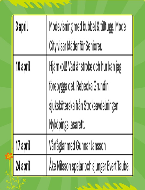 På torsdagar kommer externa föreläsare och informerar och pratar om ämnen som är intressant för oss Seniorer. Mötena börjar kl. 13:00 och håller på cirka 2 timmar. Mötena sker i samarbete med kommunen och PRO.