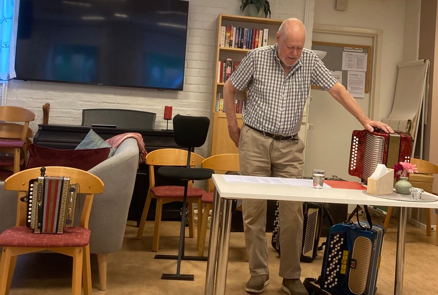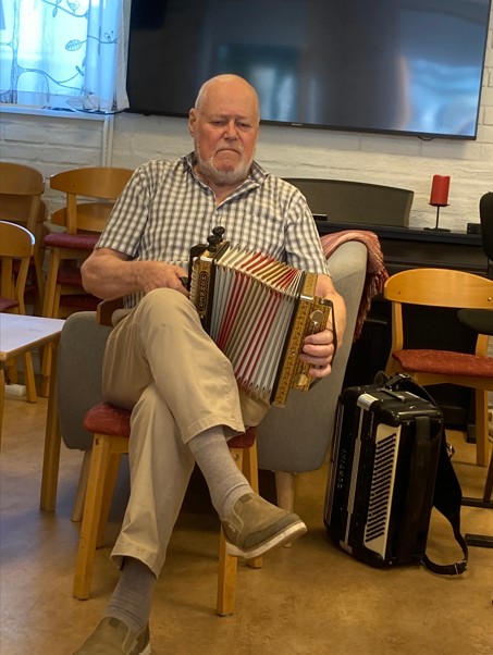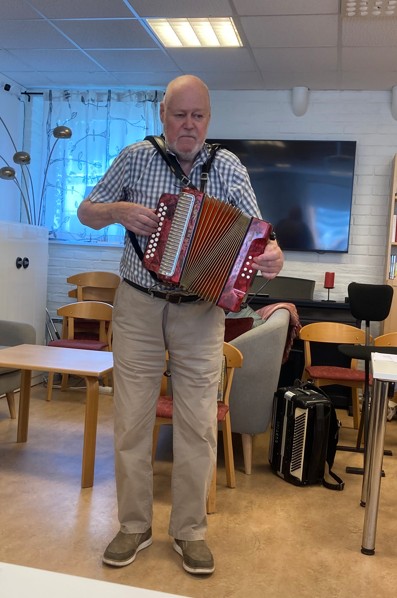 Intressant var det också att Billy förklarade hur dragspelet funkade med tunna metallplattor som sätts i dallring av en luftström och då uppstår toner. Han spelade sedan på olika dragspel för publiken. Det enklaste enradigt, sedan durspel (tvåradigt) och också på sitt stora dragspel. Vid många tillfällen har vi i vår förening haft glädjen att få höra ”Billy me´ Skogsundarna o Leffe” spela och skapa stämning vid olika aktiviteter.