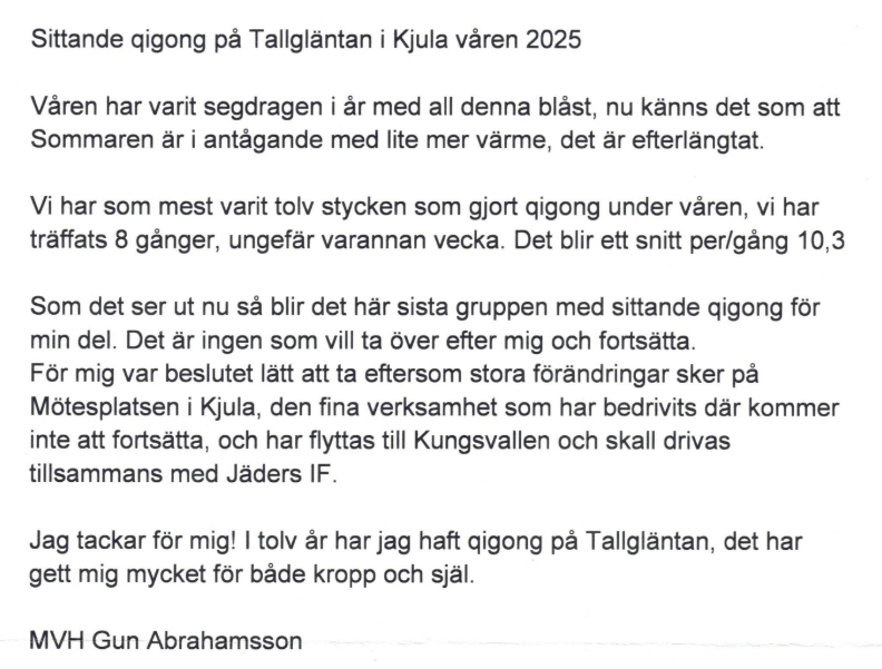 Sittande Qigong för pensionärer på Tallgläntan Kjula Våren -25