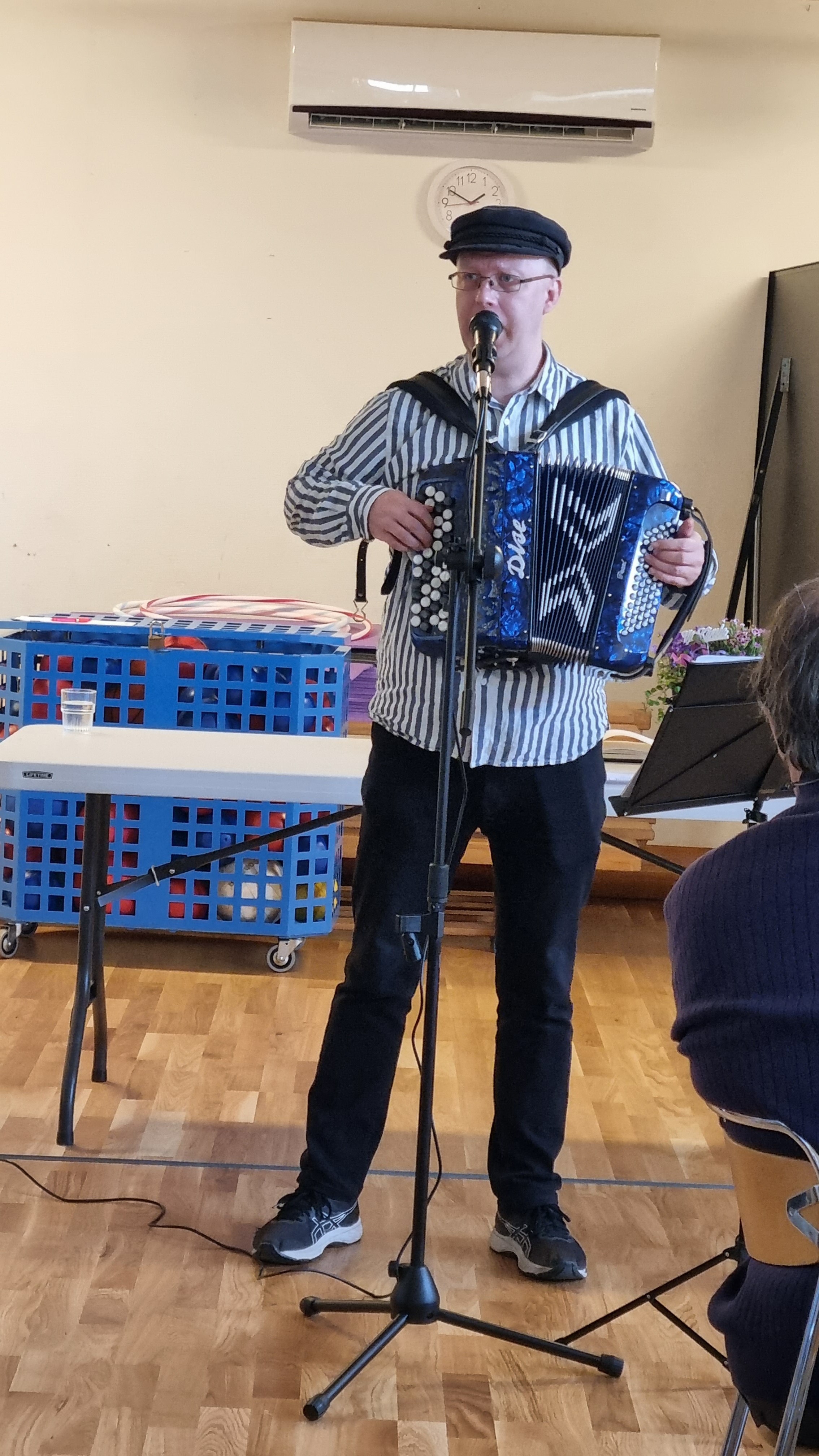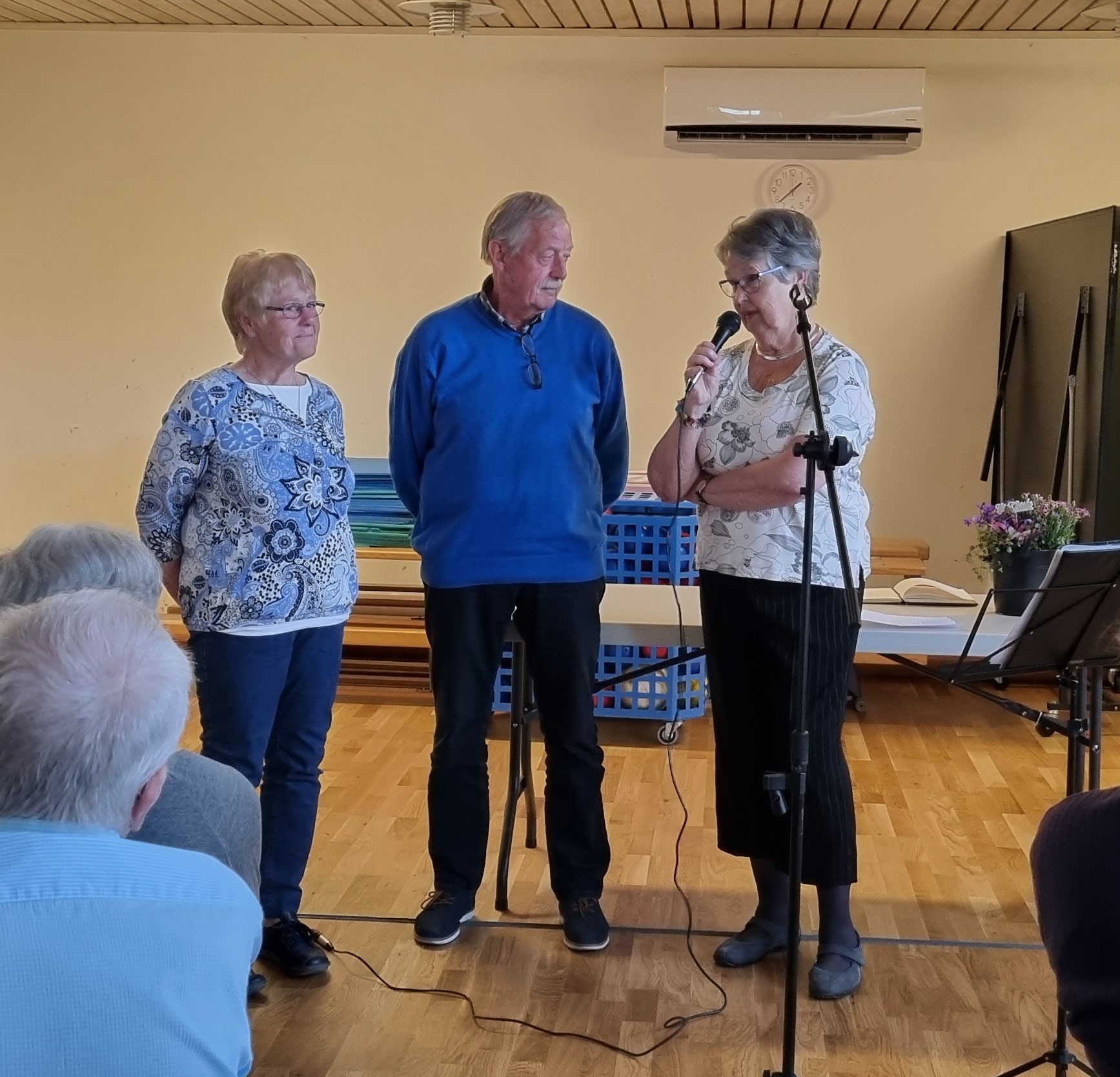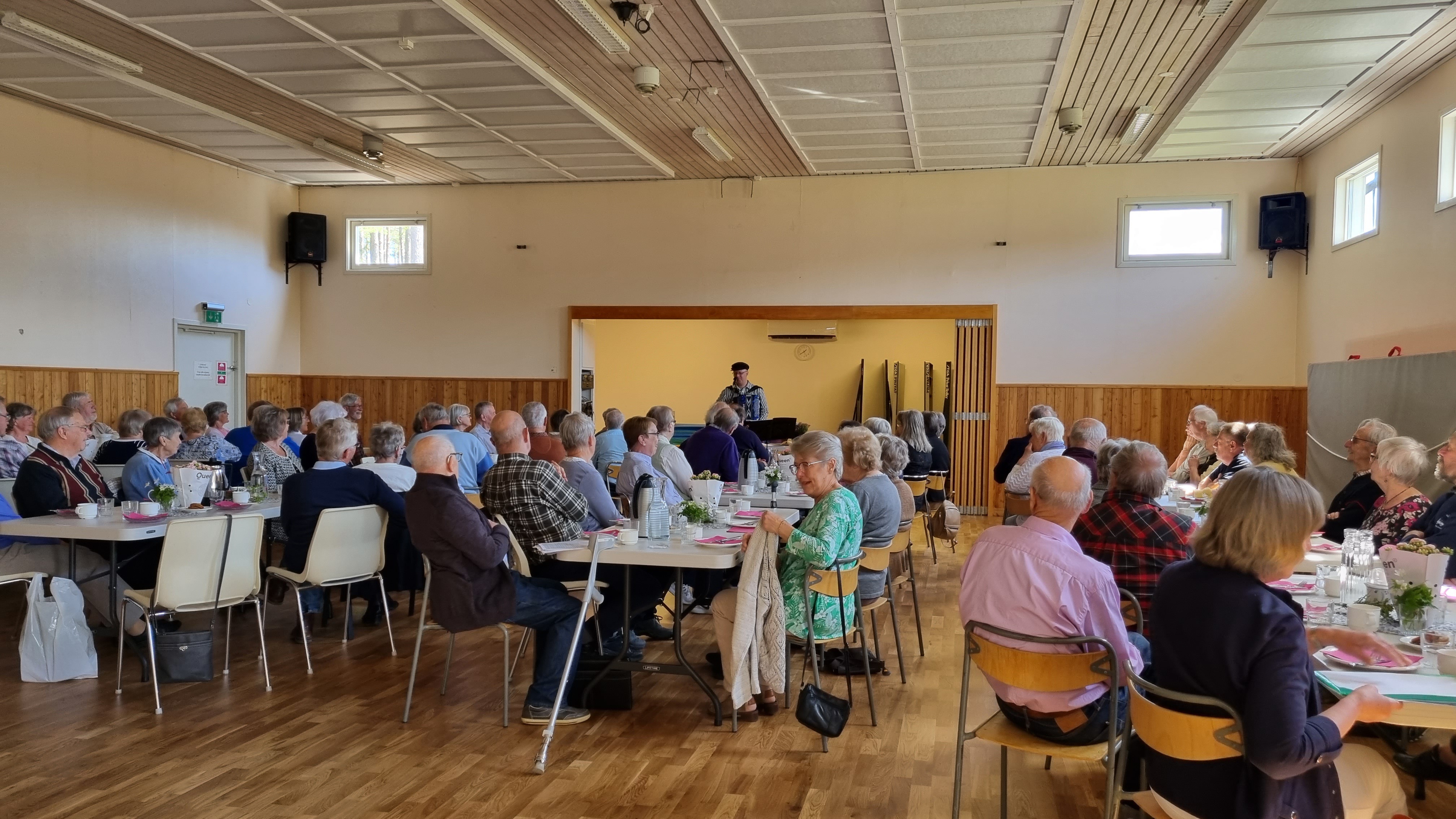 Måndagen den 9 maj hälsade Inger Frisk oss välkomna till vårt sista månadsmöte på Dambroängen, from september är vi tillbaka i Tuna församlingshem. Dagens underhållare var Kaj Lärka som under rubriken ”Bondkomik i hambotakt” sjöng visor av bl a Povel Rammel och Skånska Lasse.