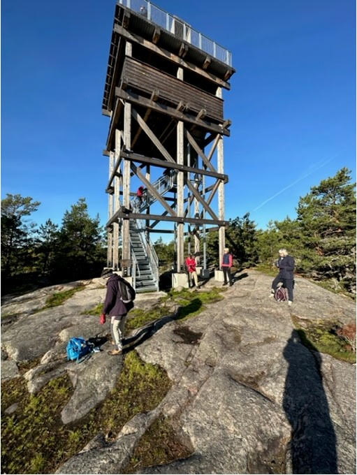 Vi gick från entré Äspskär (första parkeringen) på stigar via Spishuset och vidare till utsiktstornet som några klättrade upp i och beundrade utsikten utöver skärgården. Sedan gick vi ut till själva Stendörren vid sundet, där det i fornstora dagar fanns en krog. Vi vandrade vidare förbi ett stängt Naturum med siktet inställt på en fikarast på klipporna vid hängbron över till Stora Krokholmen.