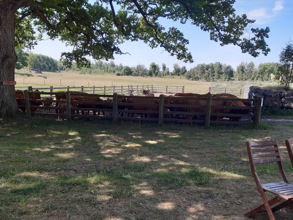 Denna fina sommardag steg vi på bussen i Stallarholmen, som skulle ta oss till ett hemligt mål. Första stoppet var Magdakullen, en gammal gård i Västra Näshulta. En väldigt fin miljö, korna går fritt och får sköta sig själva. Ägaren berättade om gården, de olika byggnaderna och hur man sköter korna, bl.a. att man inte mjölkar dem. Efteråt fick vi kaffe och smörgås. Vi valde att sitta ute och njuta av den fina miljön. De hade också en gårdsbutik, där man kunde handla kött och annat från gården och även produkter från närliggande gårdar. Där fanns även loppis, om man ville fynda.